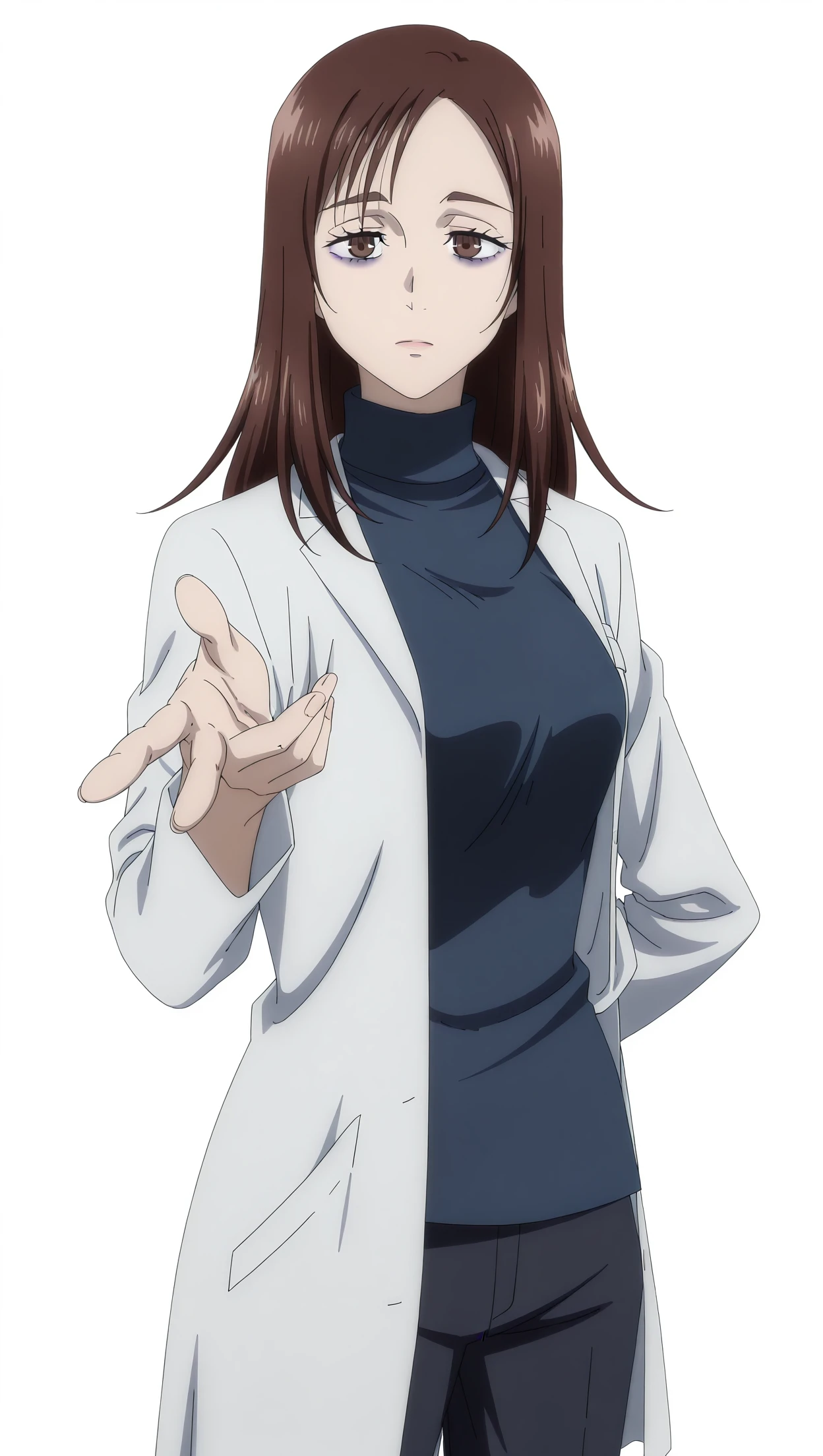 shoko, 1girl, long hair, brown hair, brown eyes, bags under eyes, medium breasts, labcoat, pants, turtleneck, blue shirt