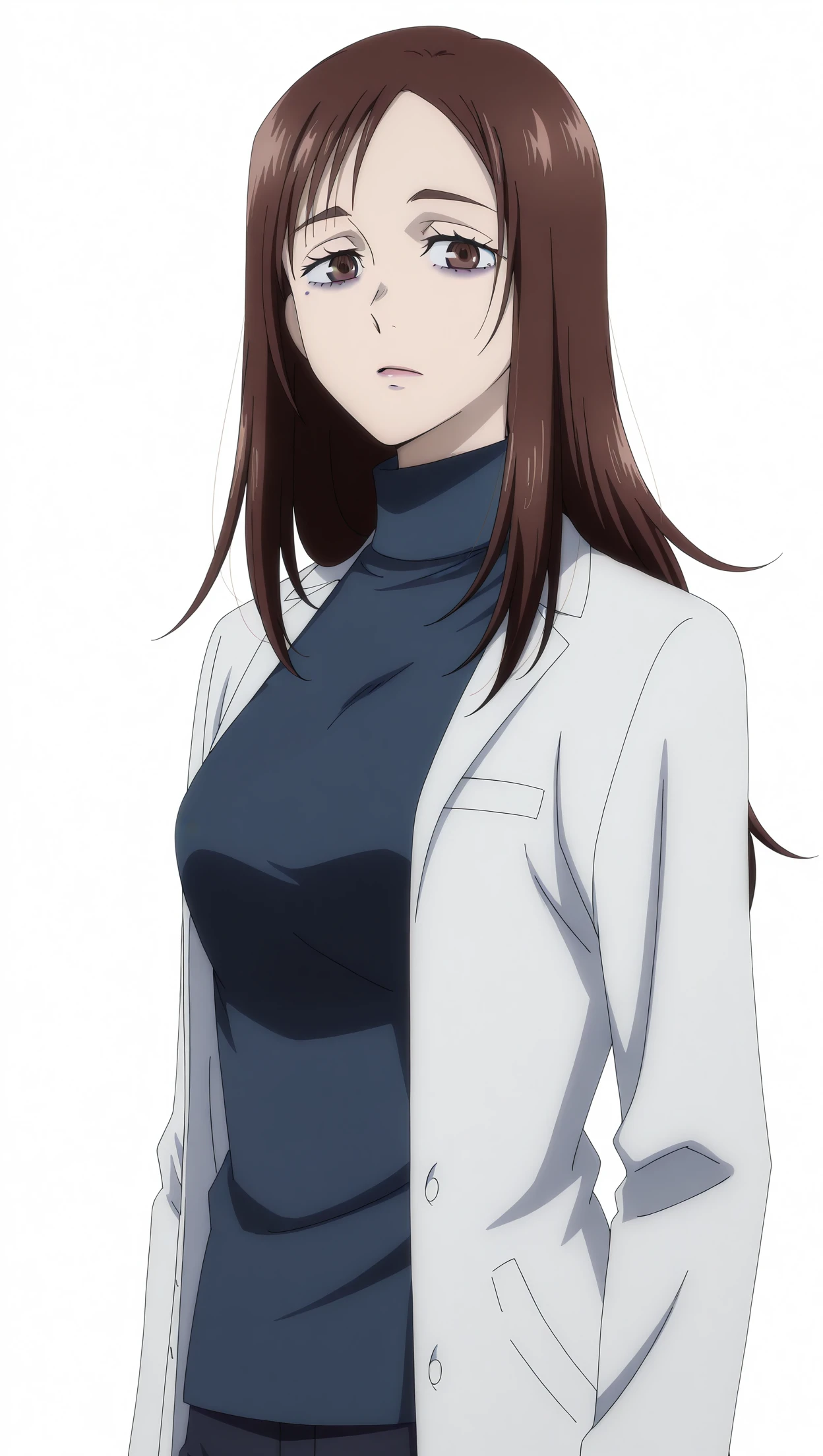 anime coloring, masterpiece, best quality, amazing quality, shoko, 1girl, long hair, brown hair, brown eyes, bags under eyes, medium breasts, labcoat, pants, turtleneck, blue shirt, solo, pose, standing, looking at viewer, white background, simple background