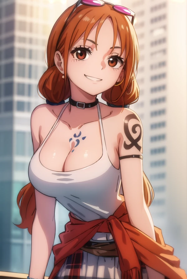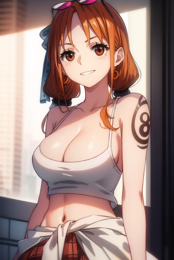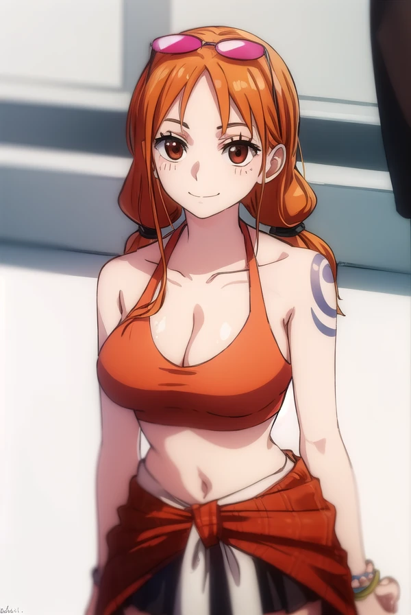 nami, long hair, twintails, (brown eyes:1.5), orange hair, (forehead:1.2),