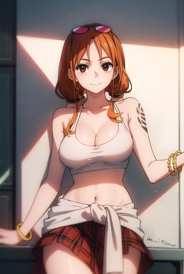 navel, cleavage, jewelry, collarbone, swimsuit, bikini, earrings, midriff, bracelet, crop top, tattoo, sunglasses, bikini top only, eyewear on head, bangle, clothes around waist, skirt, plaid skirt, pleated skirt, red skirt,