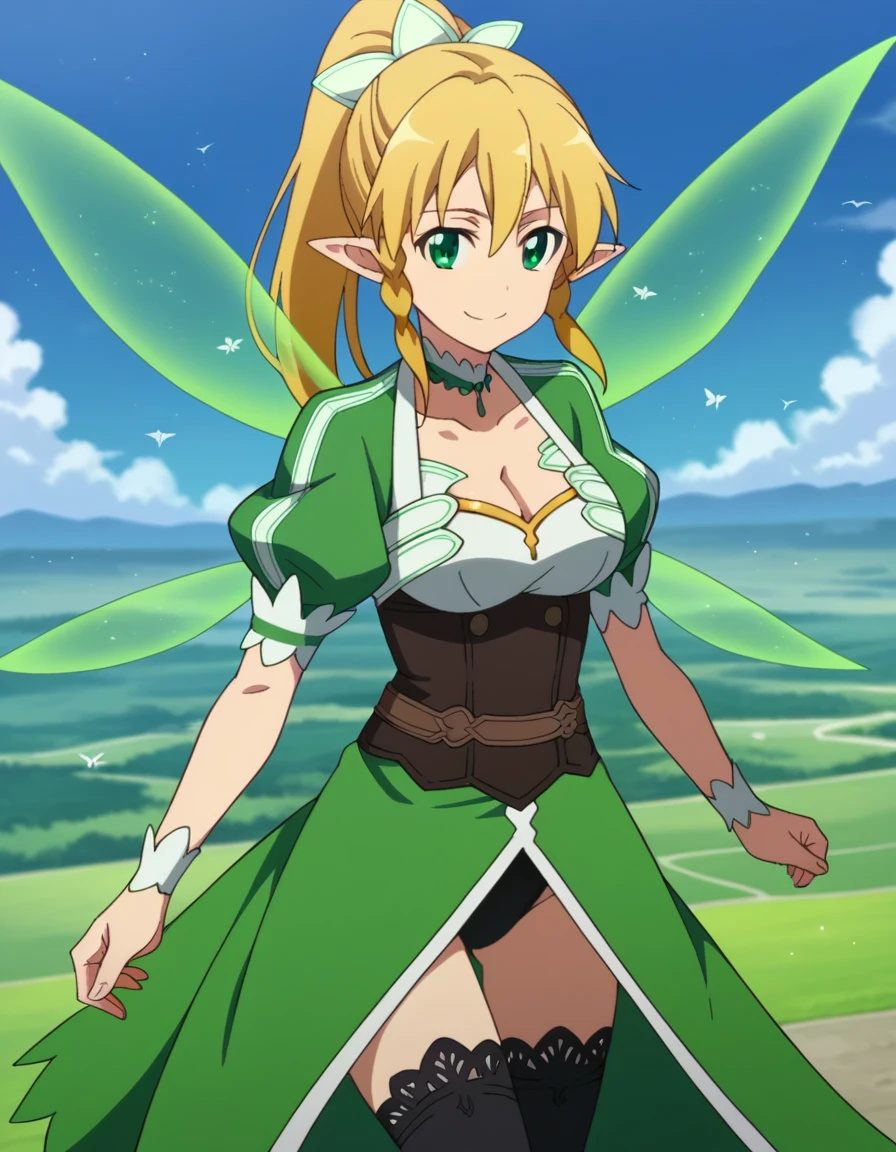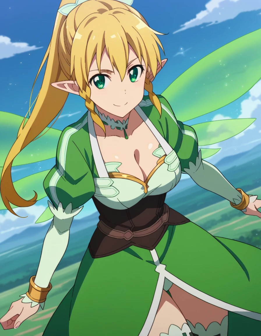 suguha kirigaya, long hair, blonde hair, hair between eyes, green eyes, ponytail, braid, pointy ears, twin braids,