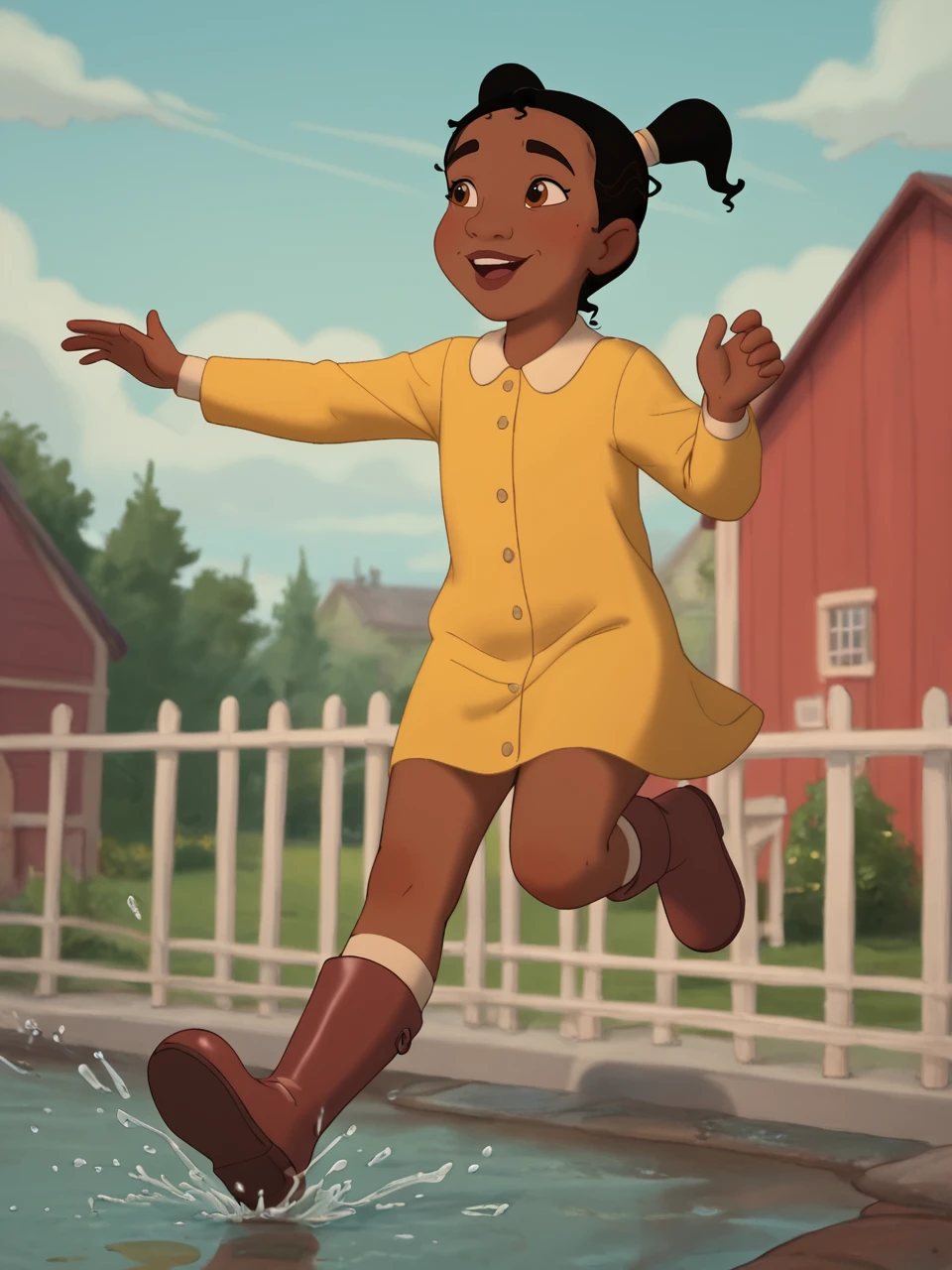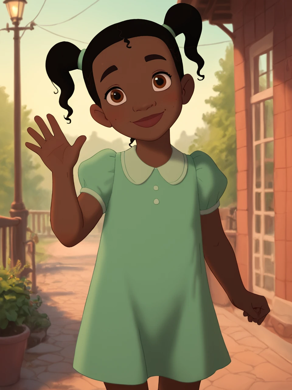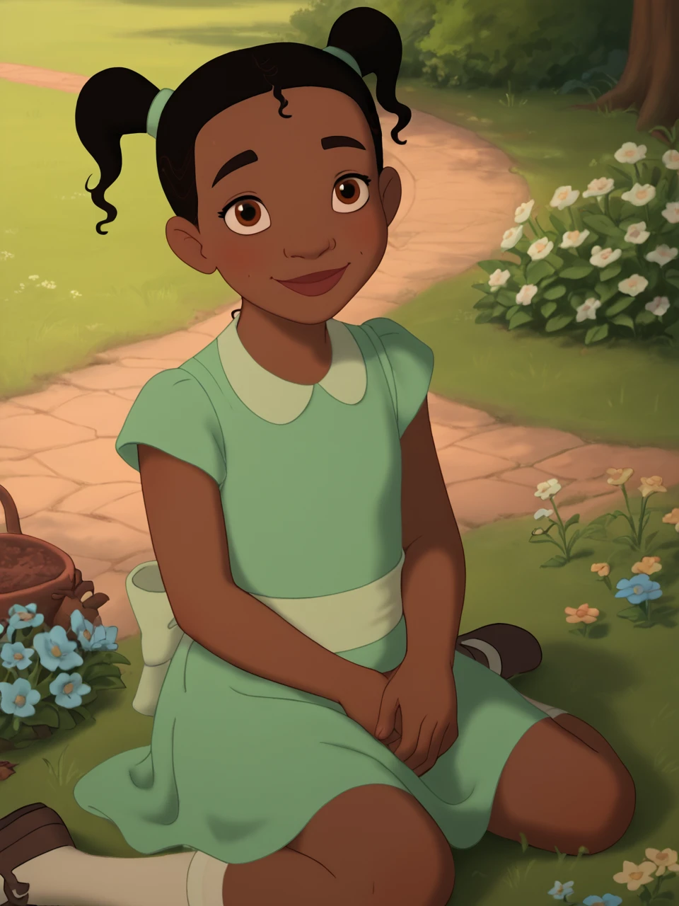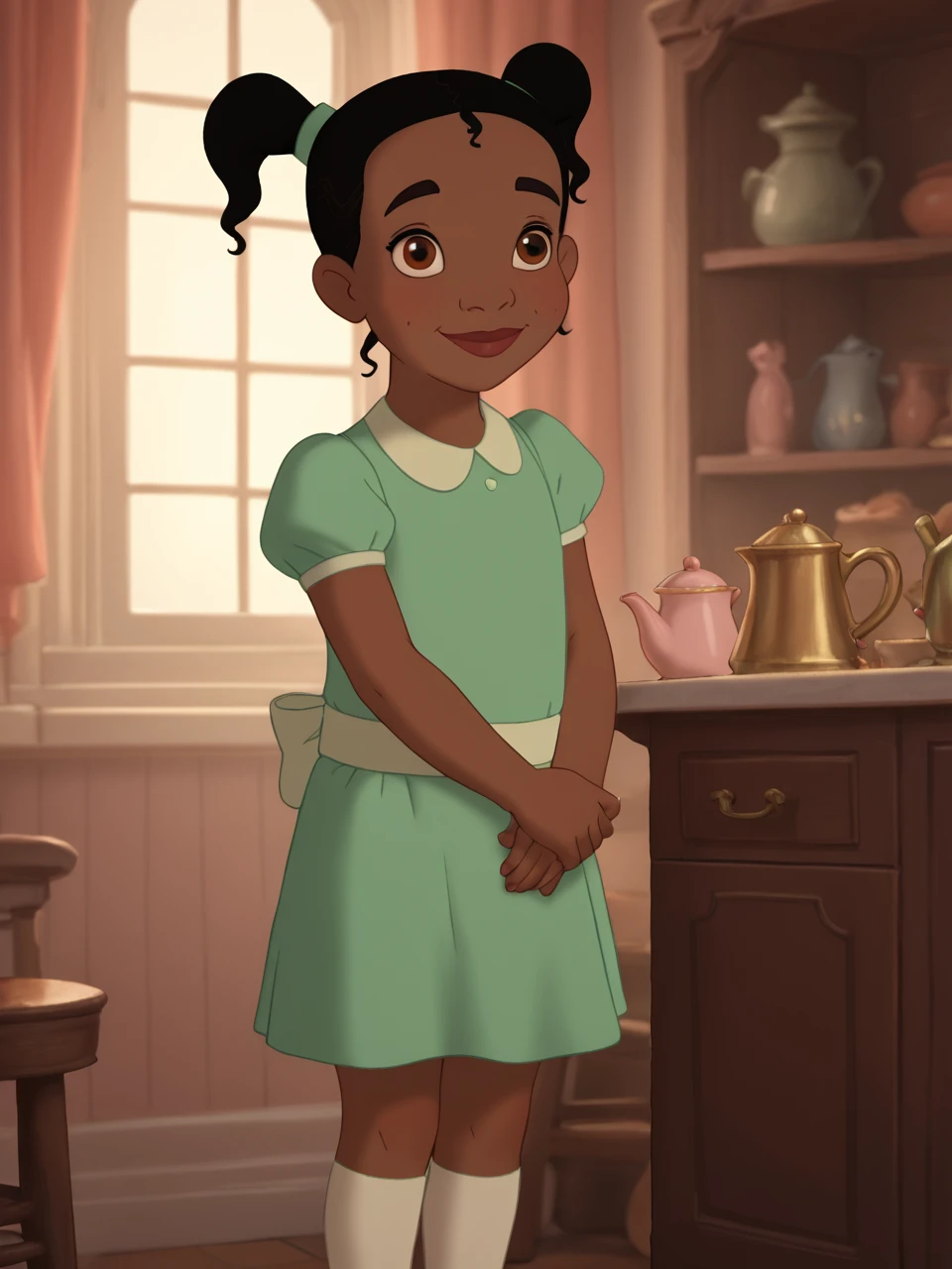 L1ttl3Ti4n4, 1girl, solo, black hair, brown eyes, twintails, dark-skinned female, white socks, mary janes, green dress, female child,