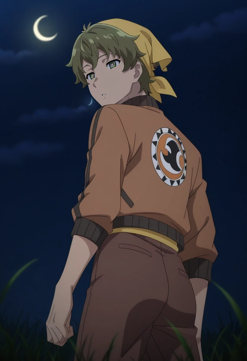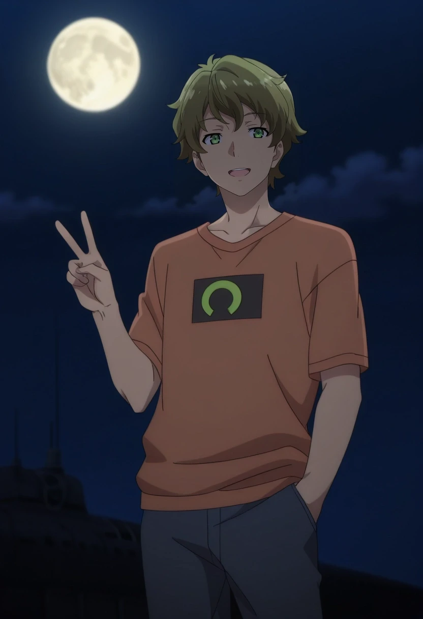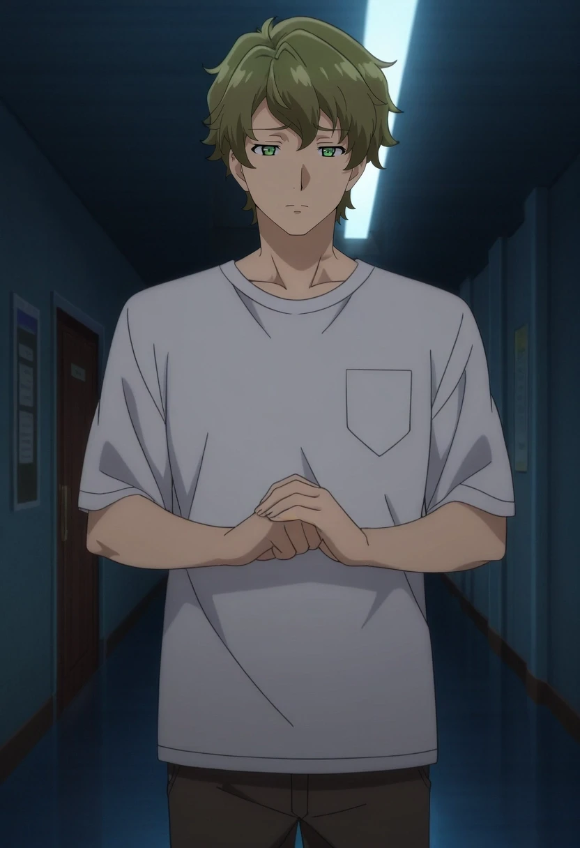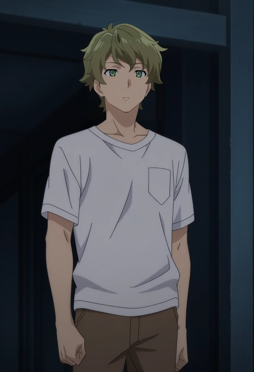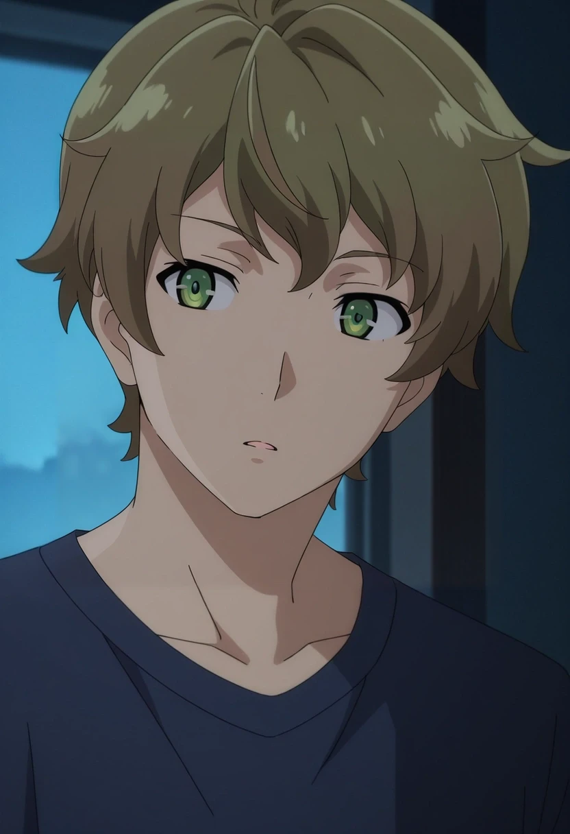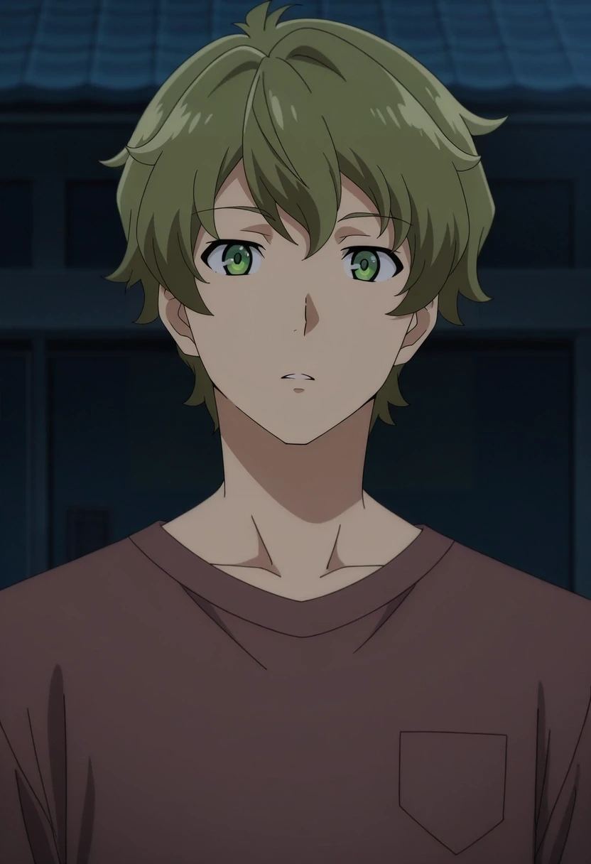 yuuma_kunimi, brown hair, green hair, green eyes, short hair
