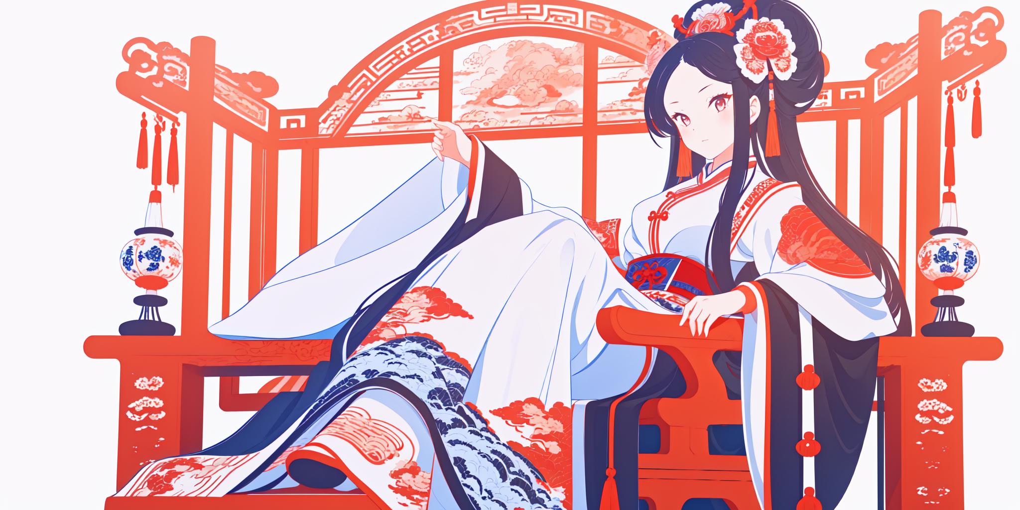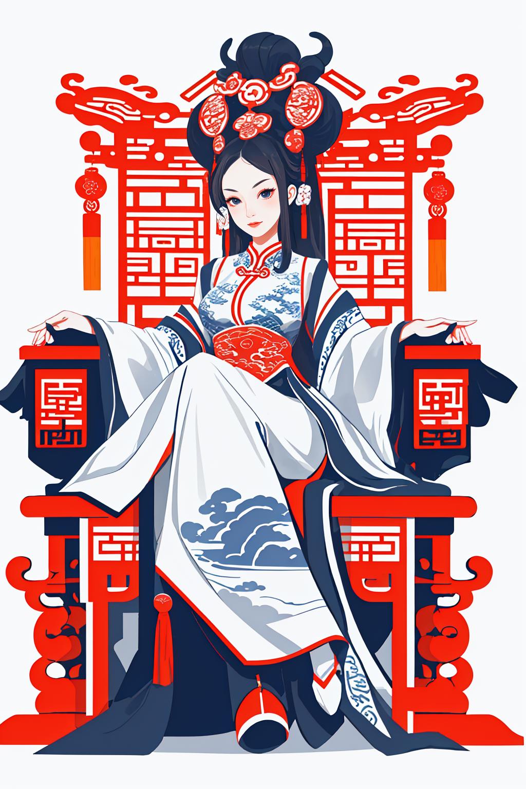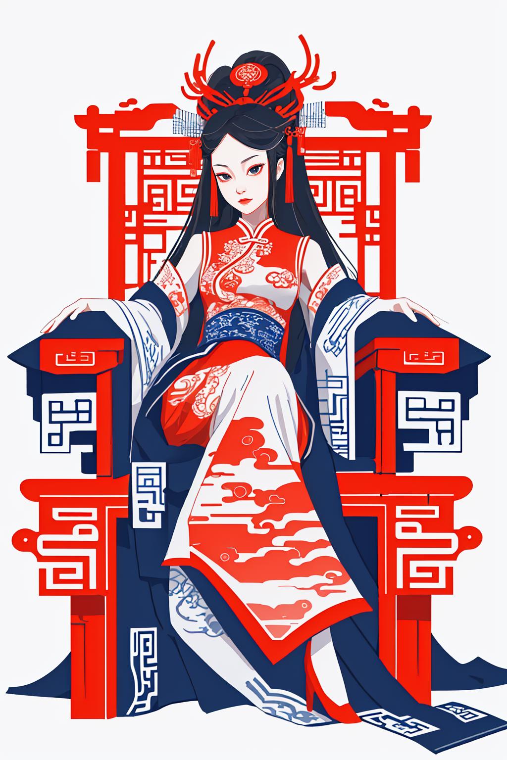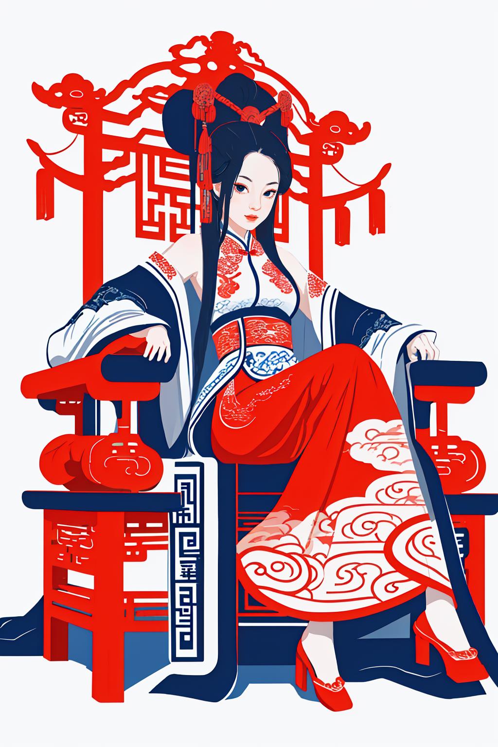 场景做了固化,,中国红加蓝的配色,身穿华服坐在红色椅子上面,气场拉满!