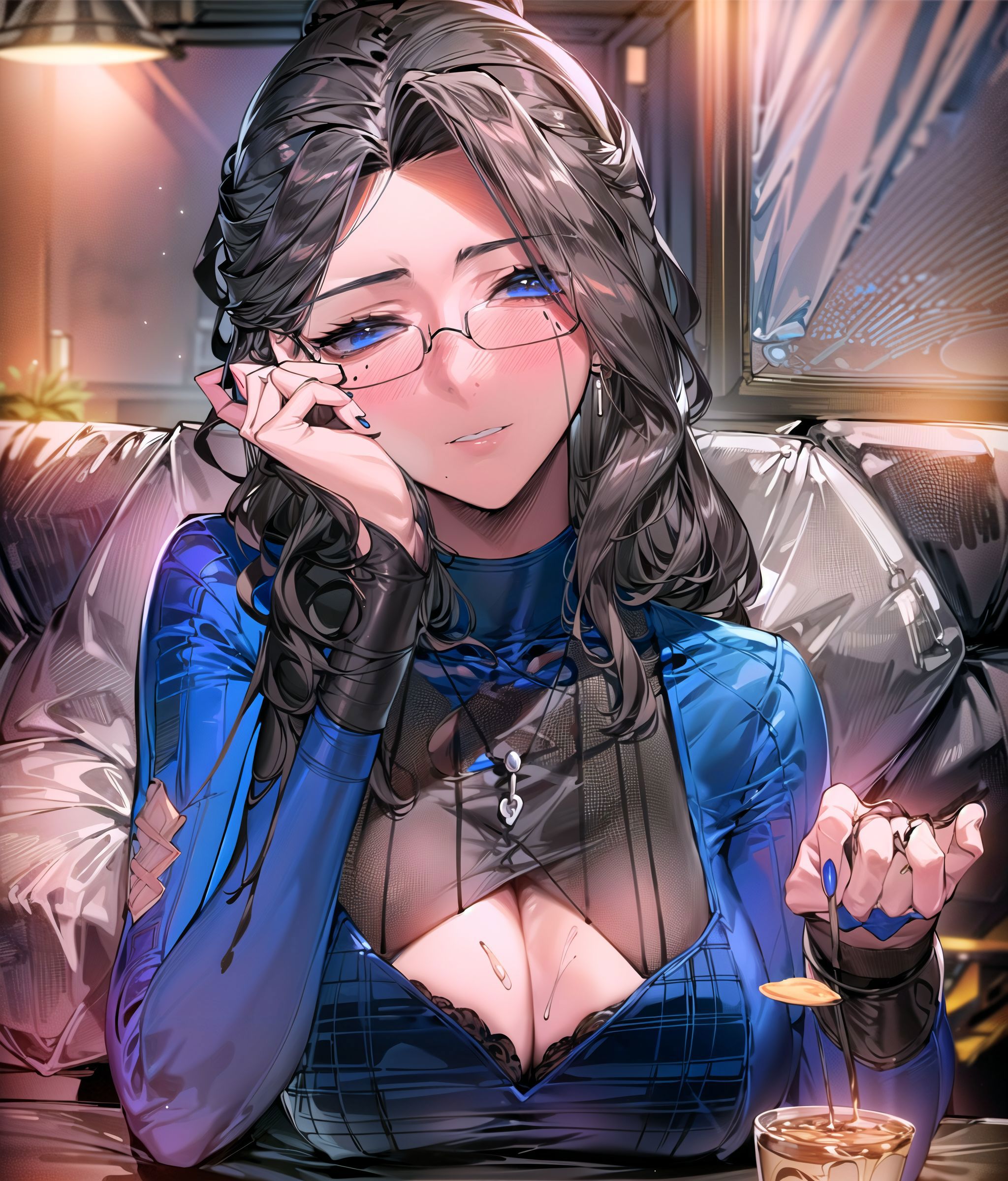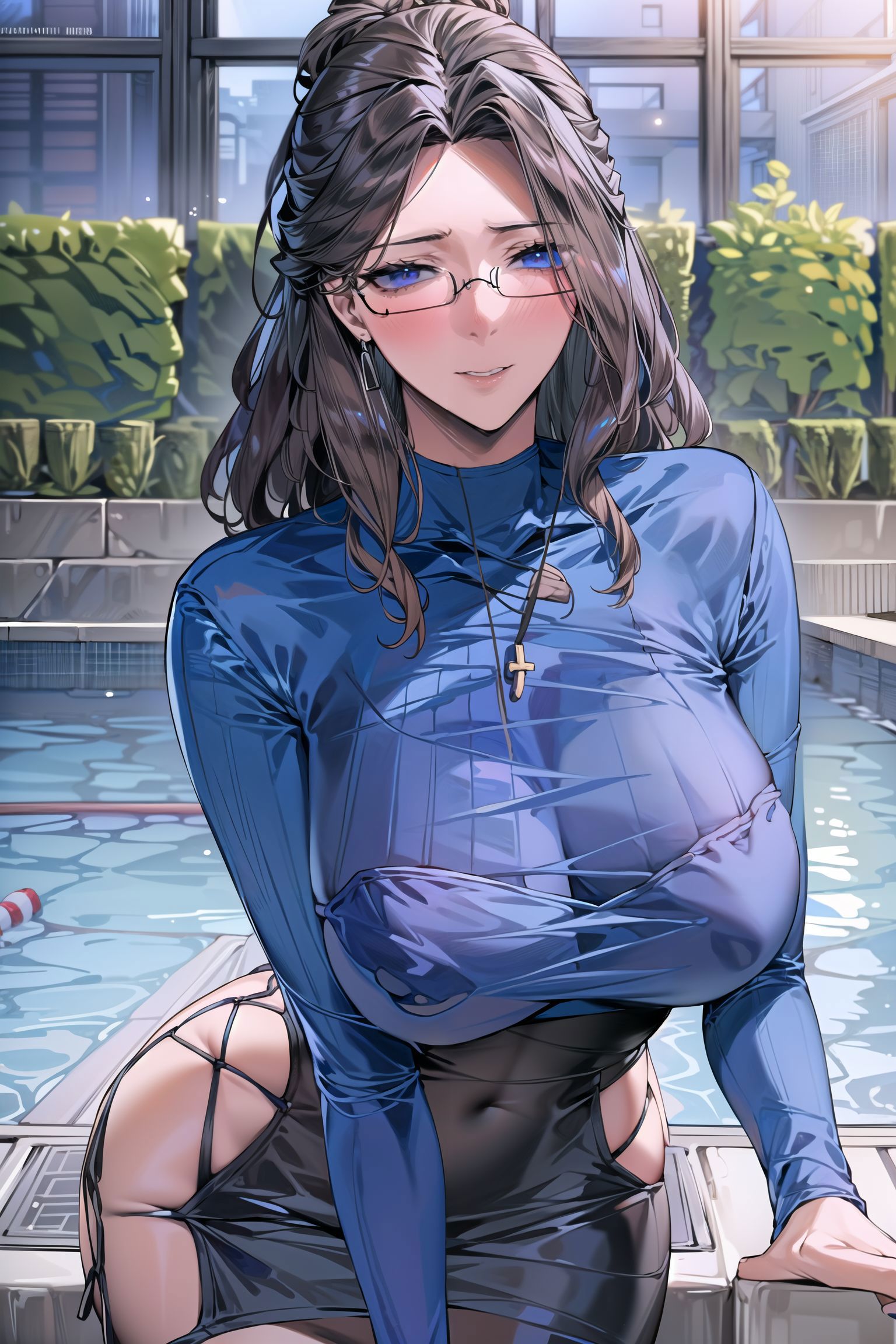 主要((((觸發詞)))):inoue,1girl, large_breasts, glasses, blue_eyes, brown_hair, long_hair