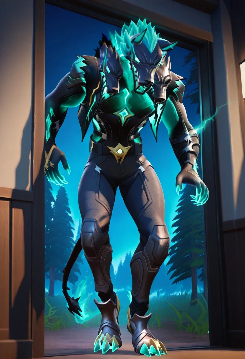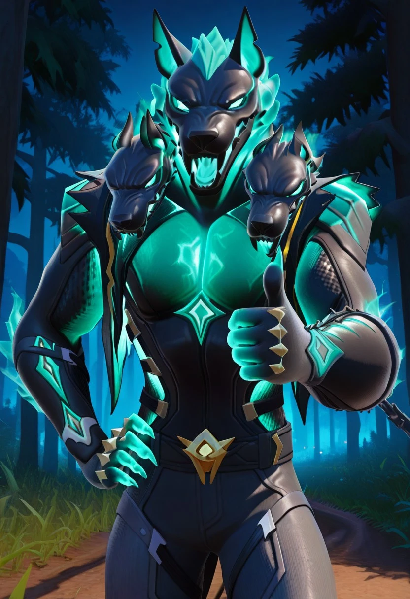 cerberus, anthropomorphic hellhound, wolf heads on shoulders, ripped jacket, muscular build, glowing teal eyes, black fur, spiked cyan hair with flames, pointed ears, dark tactical suit, gray pants, cyan glowing accents, belt with golden buckle, chest armor with cyan glow, arm guards, spiky chains on one arm, armored shoes with clawed feet, clawed hands, long black tail with a small snake head, supernatural black and teal flames, pectorals,