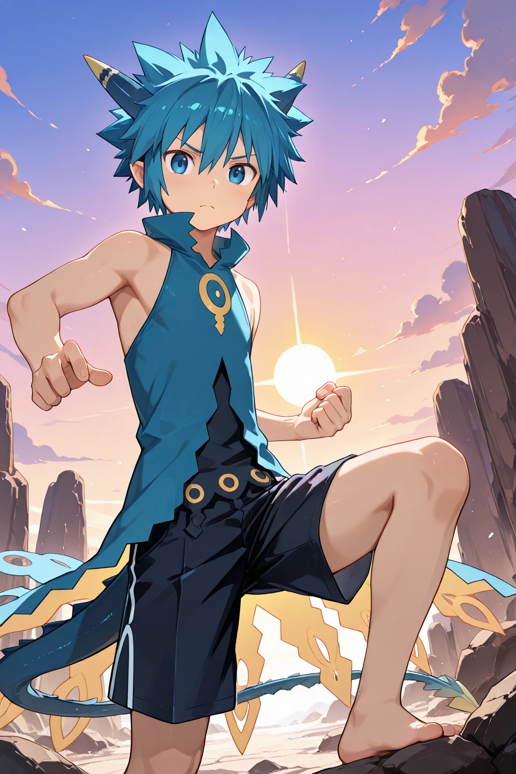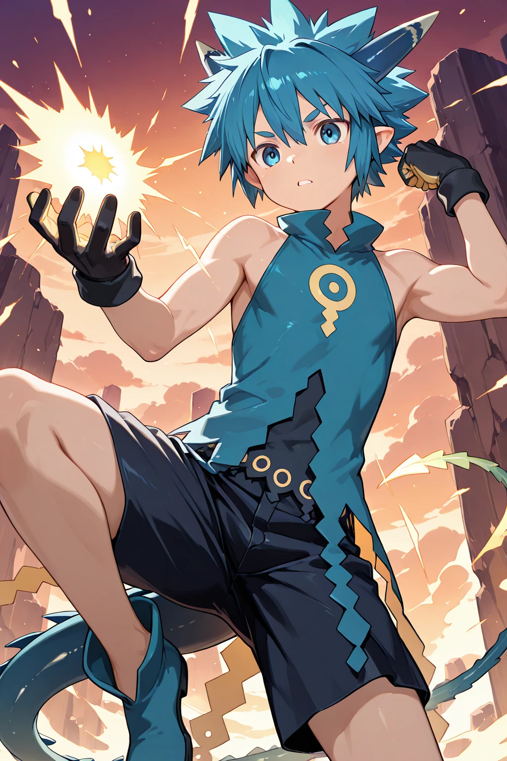 lyrum, blue_eyes, blue_hair, dragon_horns, black_shorts, dragon_tail, black_shirt, blue_coat, gloves,