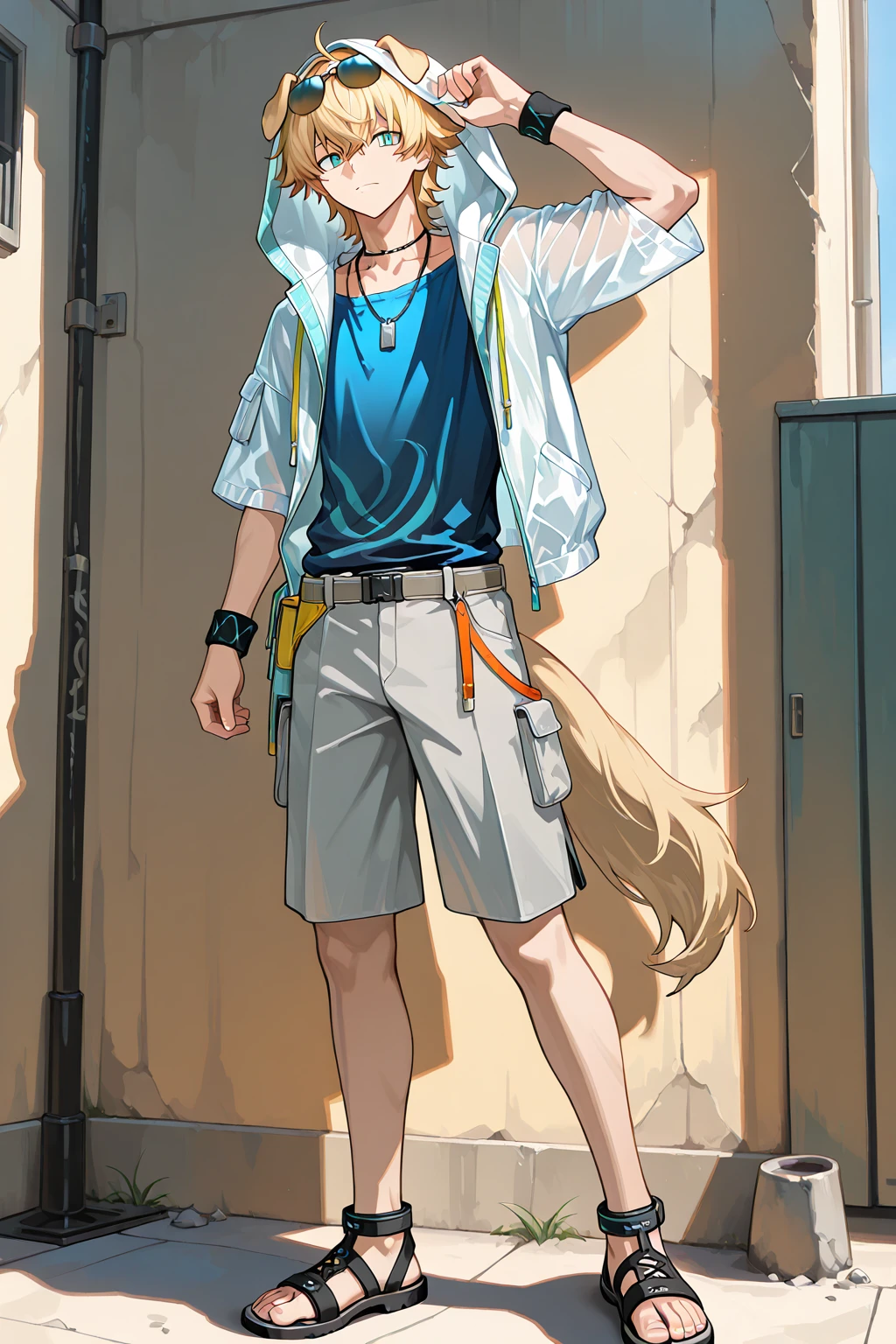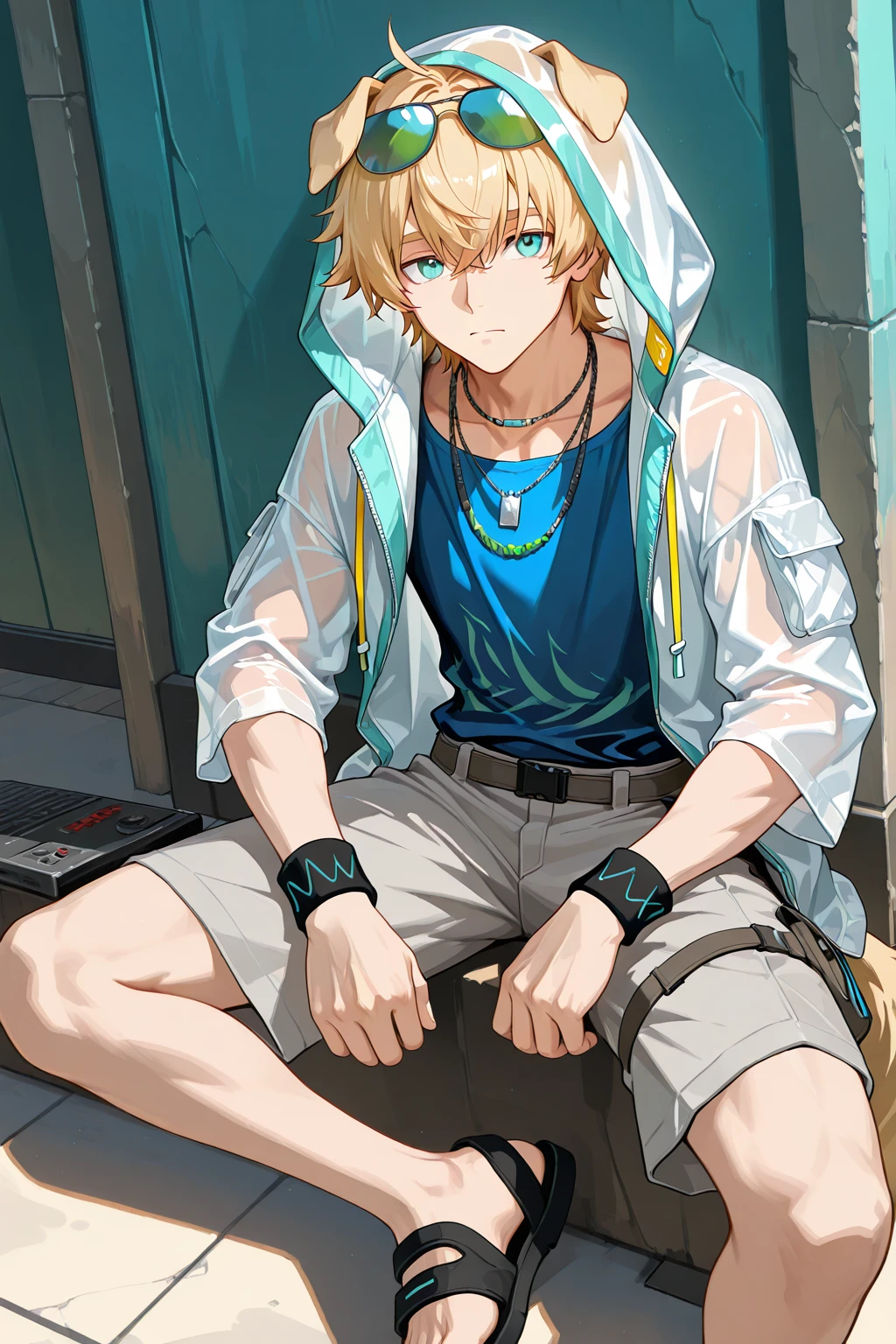 arknightstequila, blonde_hair, green_eyes, animal_ears, dog_ears, dog_boy, , default, jewelry, blue_shirt, see-through_jacket, hooded_jacket, grey_shorts, necklace, belt, wristband, infection_monitor_\(arknights\), sandals, sunglasses,