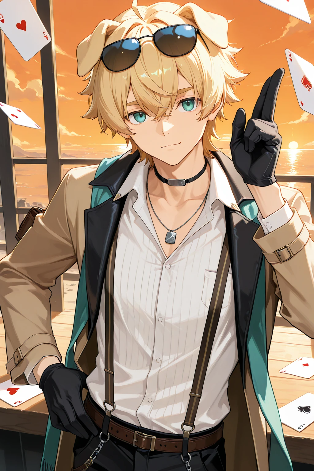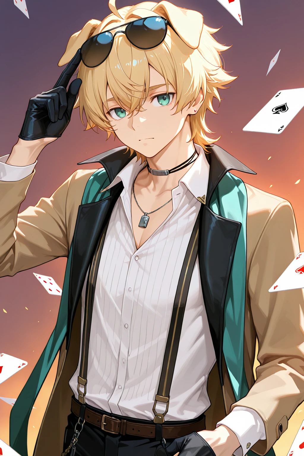 arknightstequila, blonde_hair, green_eyes, animal_ears, dog_ears, dog_boy, skin1, playing card, black gloves, half_gloves, black overalls, white_shirt, brown_coat, green_scarf, jewelry, suspenders, choker, belt, sunglasses,