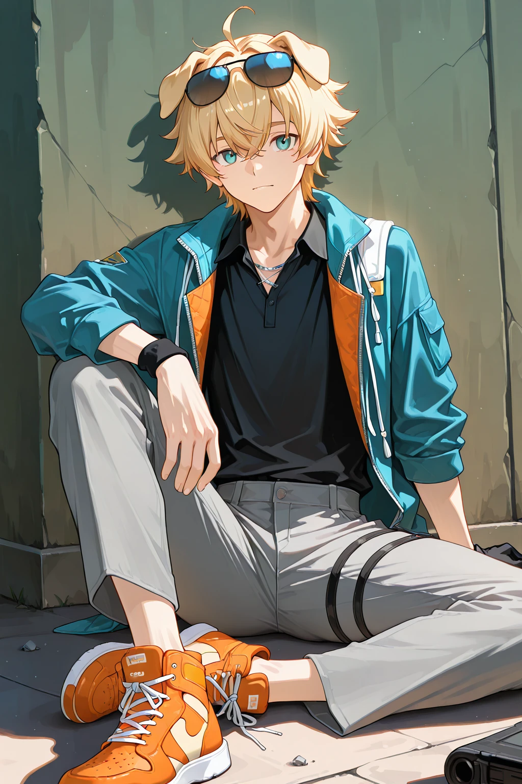arknightstequila, blonde_hair, green_eyes, animal_ears, dog_ears, dog_boy, skin2, single_glove, jacket, grey_pants, black_shirt, sunglasses, orange_shoes, collared_shirt,