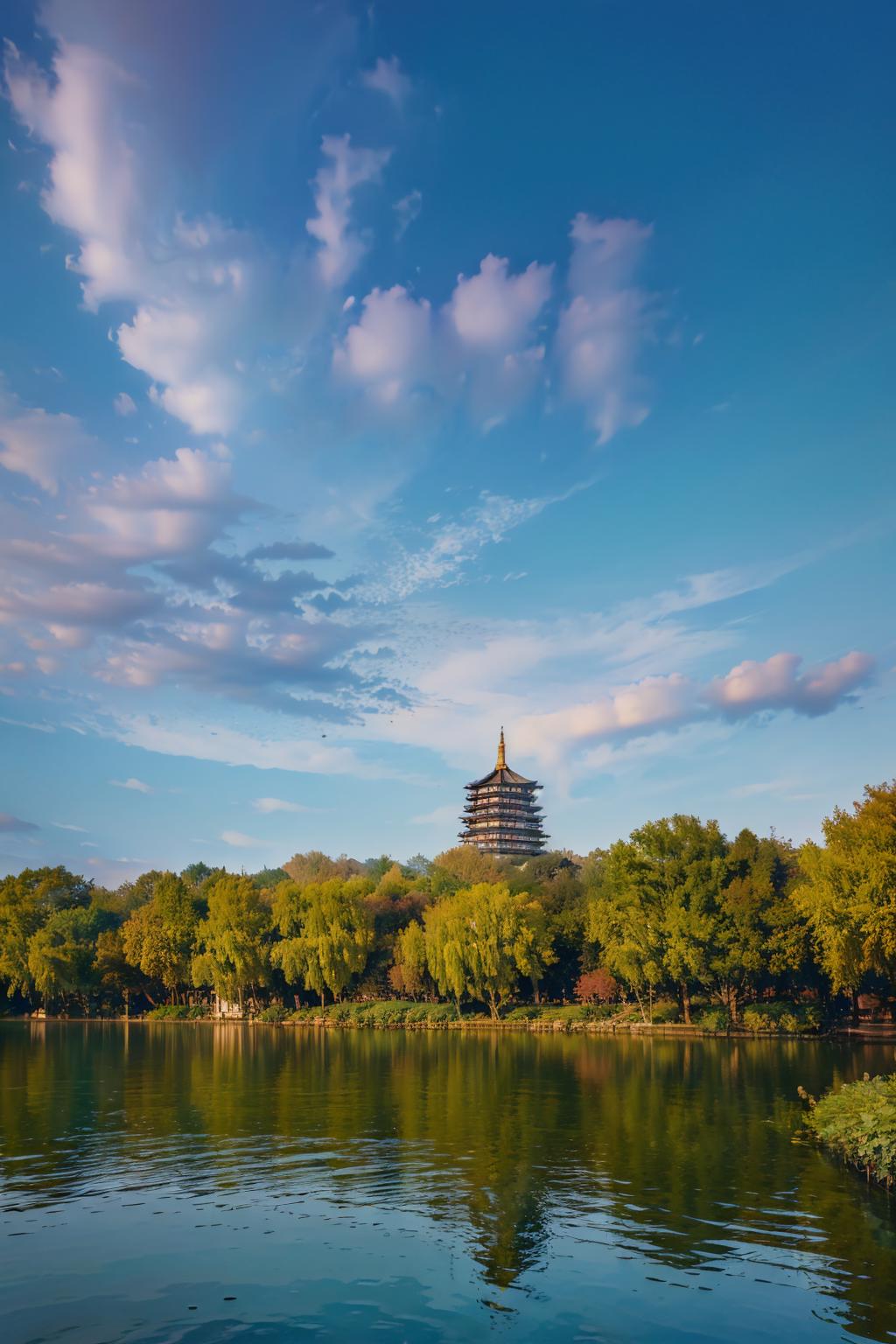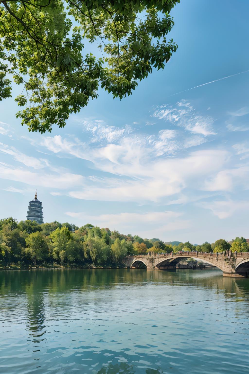 I made a background before, and it felt good. Today I made a background of my hometown, Hangzhou, China. I found some photos I took before and made it lora. You can add prompt words, horizon, tower, lake, boat, and bridge to make the picture richer.
