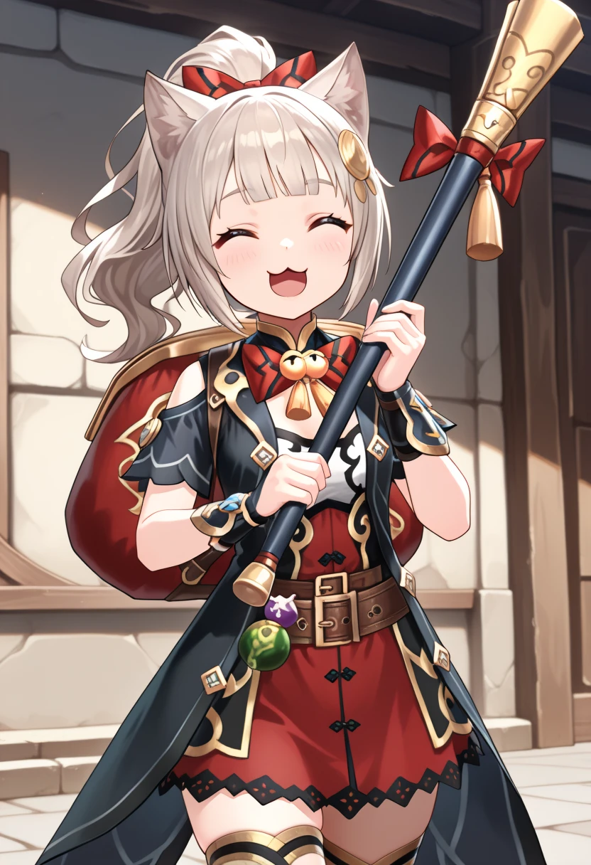 KRRequina,animal ears, solo, smile, closed eyes, weapon, holding, cat ears, holding weapon, bangs, ponytail, grey hair, tail, long hair, thighhighs, hair ornament, blunt bangs, sidelocks, belt, short sleeves,:3,