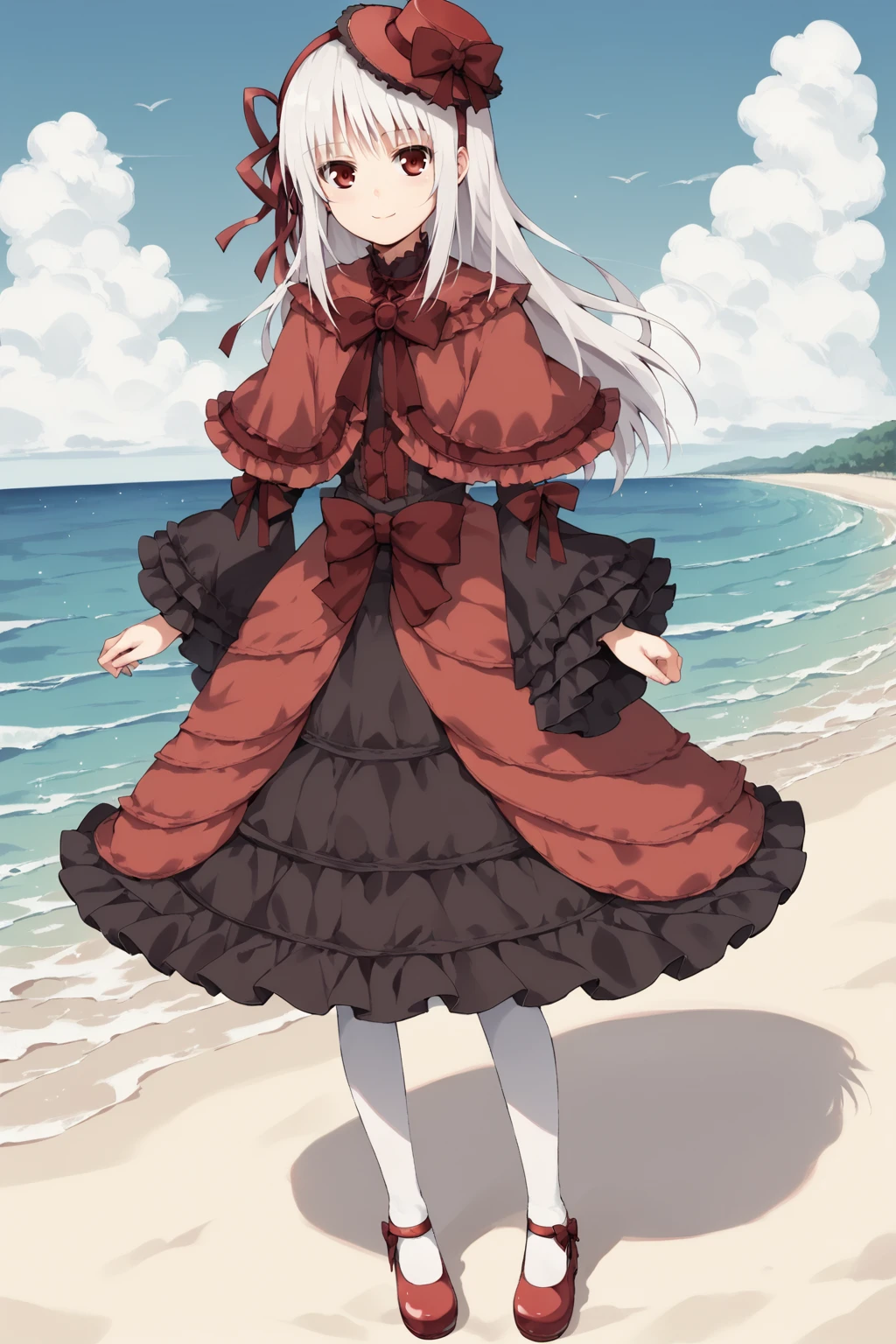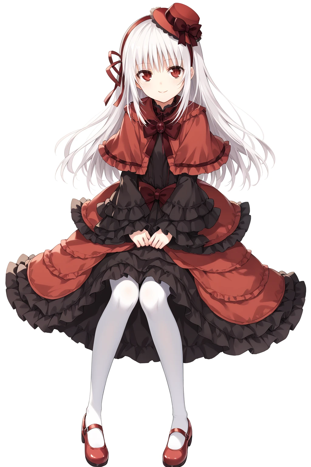 anna kushina, 1girl, solo, long hair, dress, white hair, red eyes, hat, bow, frills, capelet, ribbon, red dress, mini hat, shoes, red footwear, red headwear, white pantyhose, hair ribbon