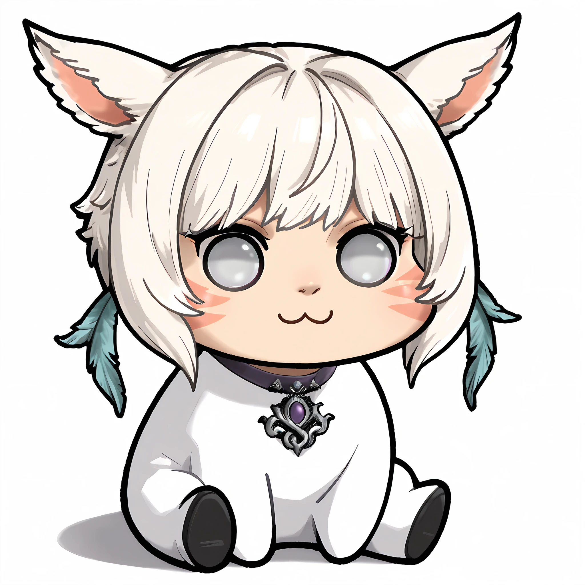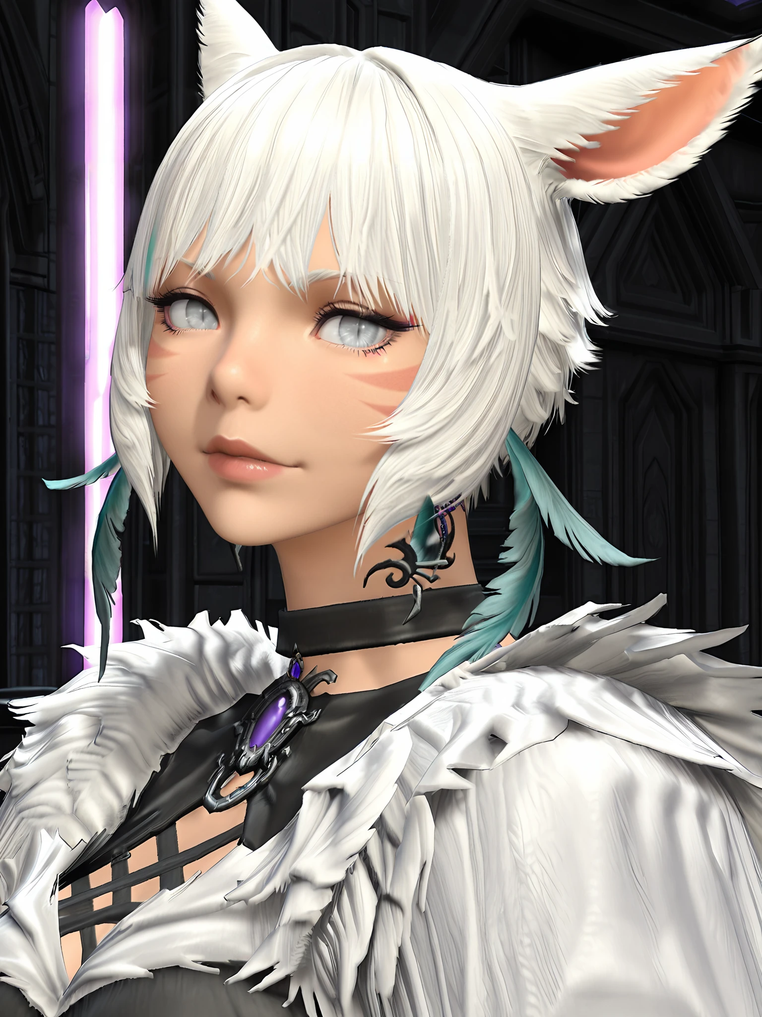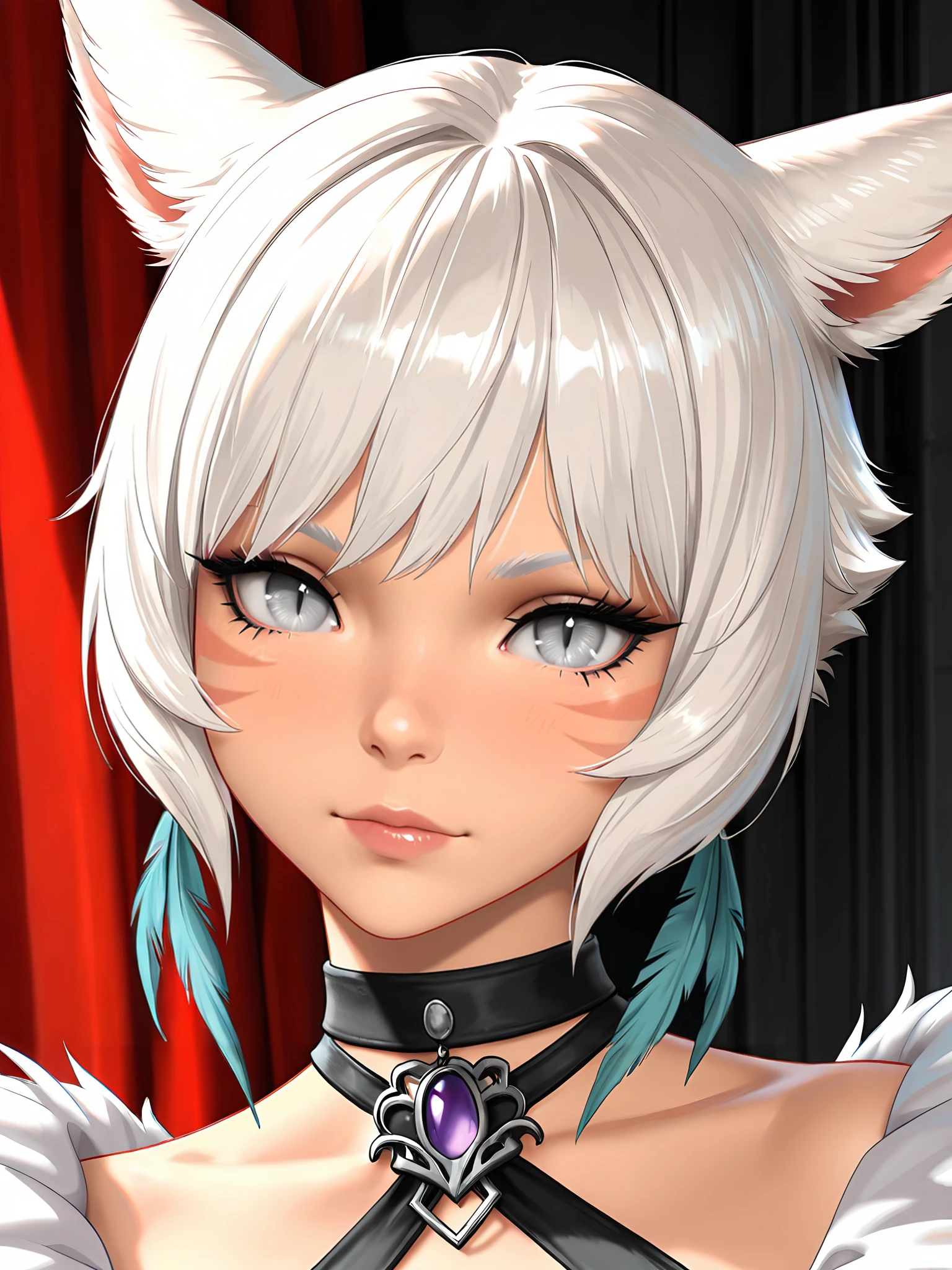 <lora:Yshtola_FF14_Illustrious:1>, YshtolaFF14, miqo'te, cat ears, grey eyes, short hair, bangs, white hair, facial mark, feather hair ornament, choker,