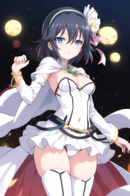 NanamiD0gDays, 1girl, solo, short hair, blue eyes, black hair, white thighhighs, hair between eyes, jewelry, medium breasts, hairband, detached sleeves, bracelet, white leotard, white sleeves, waist cape, showgirl skirt