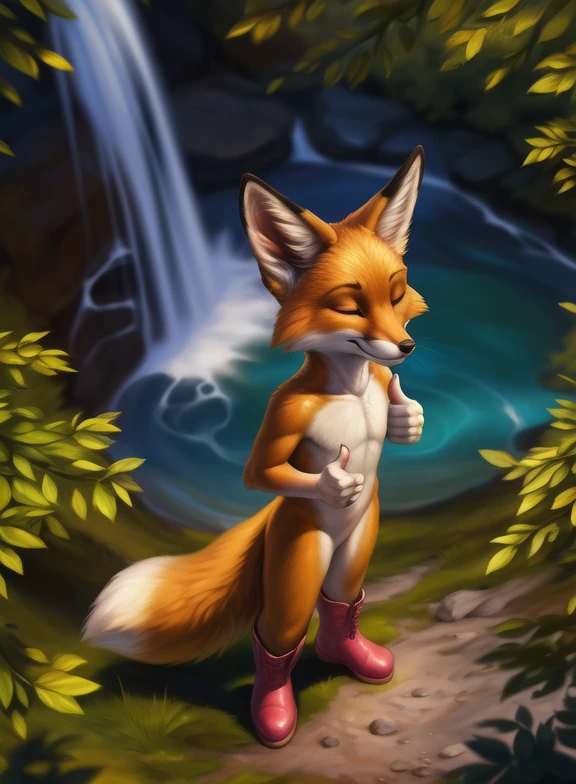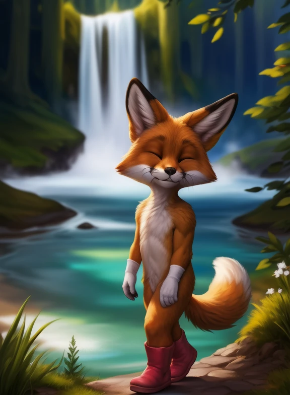 DonbeSluAra, fox, kitsune, red fur, red fur, pink boots, eyes closed, (white gloves, chibi,)