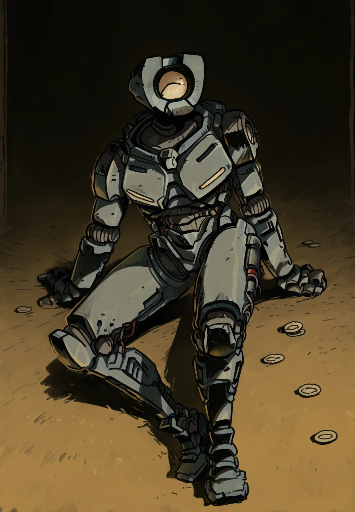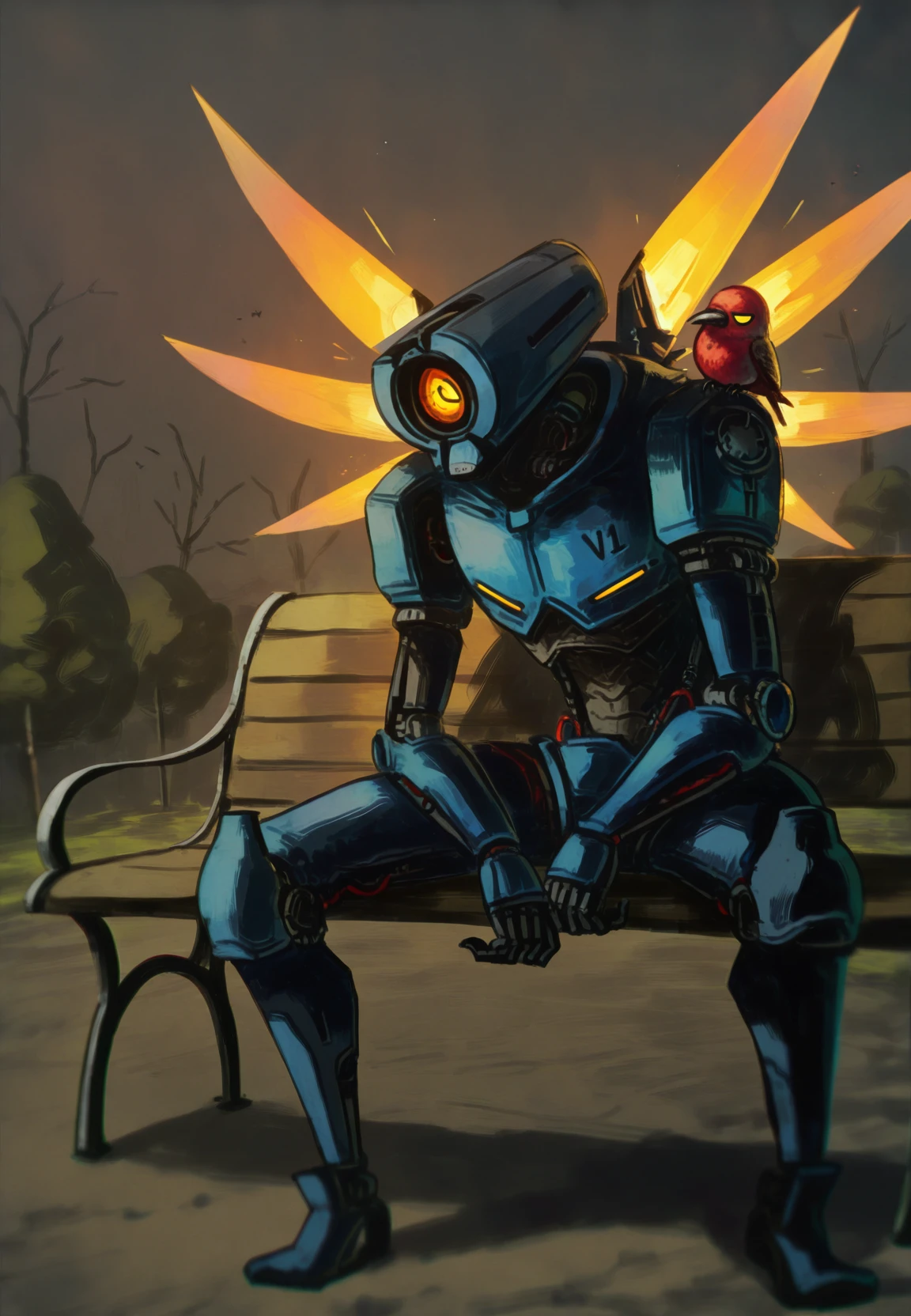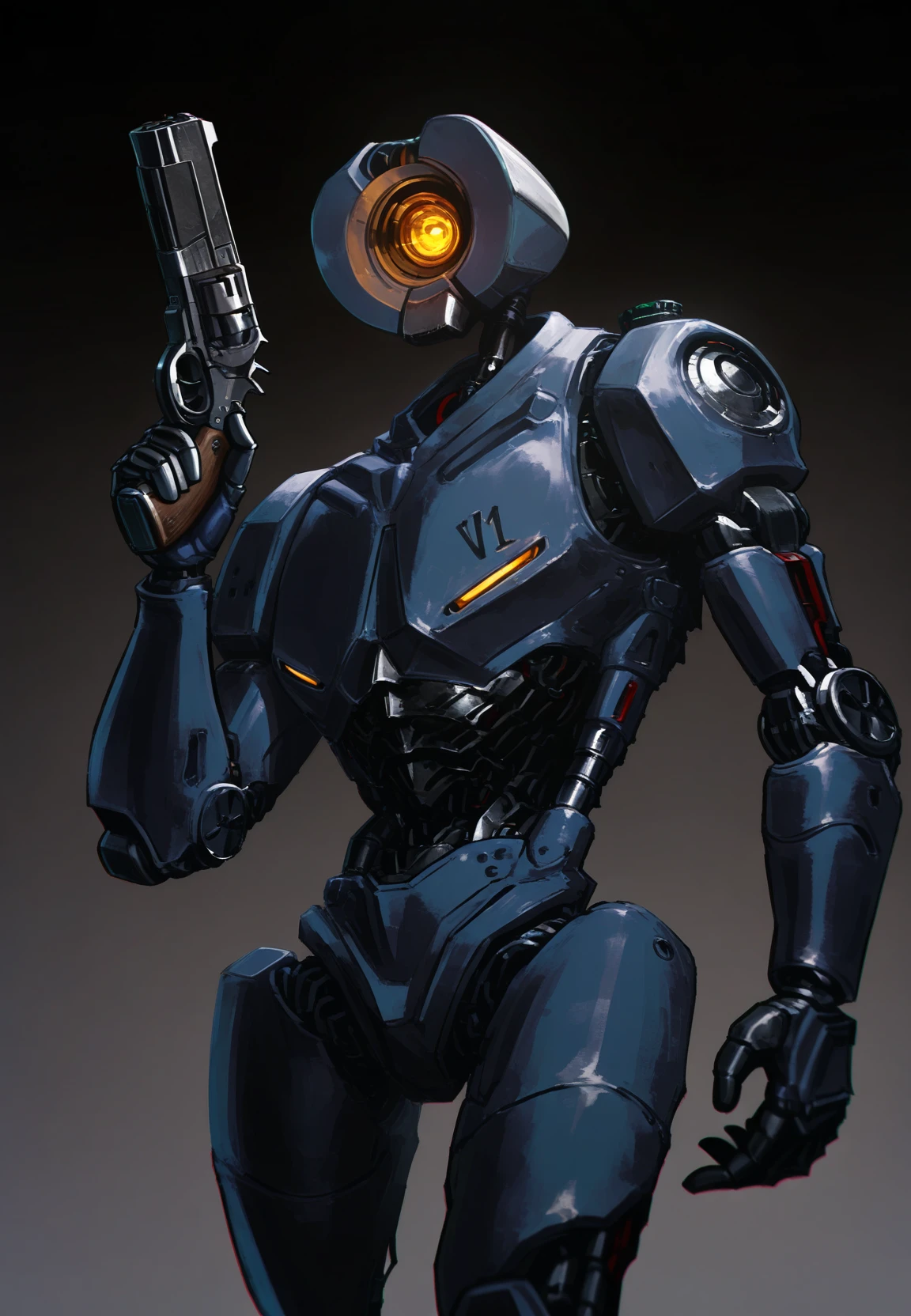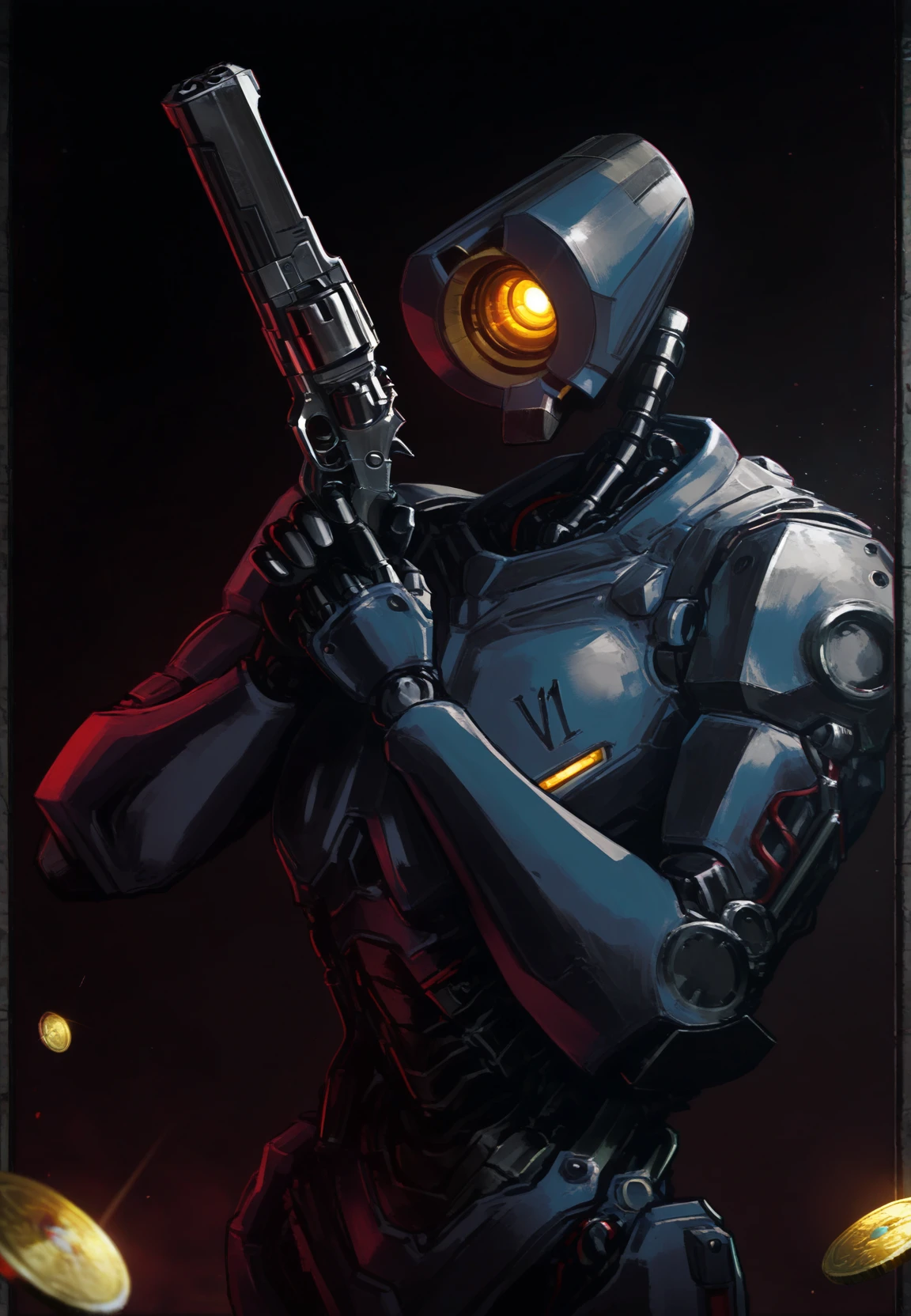 For appearance add: "v1 \(ultrakill\), male focus, (yellow marks on breasts:0.6), full body, single eye"