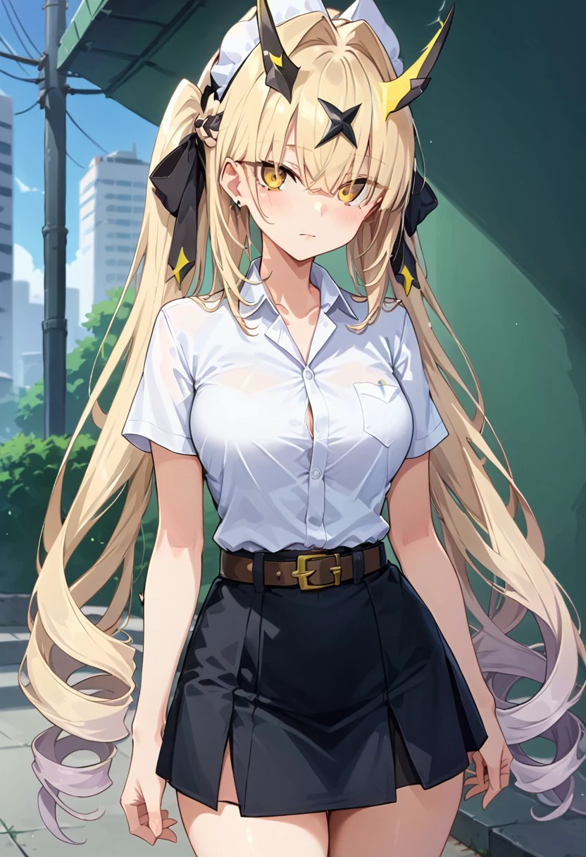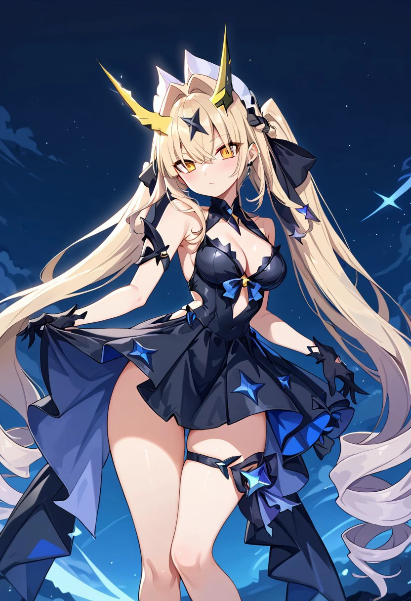 Airi_DMS, 1girl, long hair, blonde hair, multicolored hair, bangs, blunt bangs, twintails, braid, drill hair, hair ornament, horns, eyes visible through hair, hair between eyes, yellow eyes, bare shoulders, breasts, cleavage, armor, dress, black dress, blue dress, gloves, elbow gloves, legs, thigh strap, boots, high heels, black footwear, jewelry,