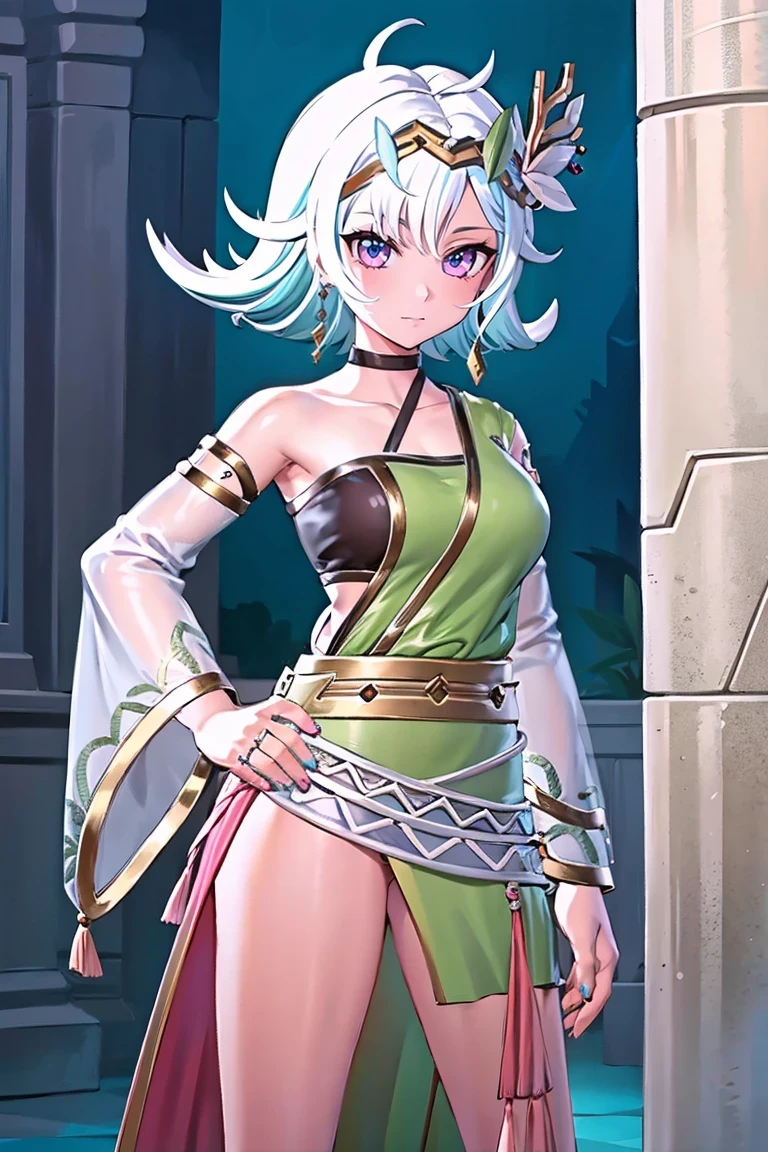 Recommended prompts: hair ornament , earrings , hair ornament ,short hair , purple eyes , white hair , aqua hair , ahoge , hair leaf , bare shoulders , black choker , green dress , strapless , long sleeves , single antler , long skirt , ahoge, asymmetrical clothes, green skirt