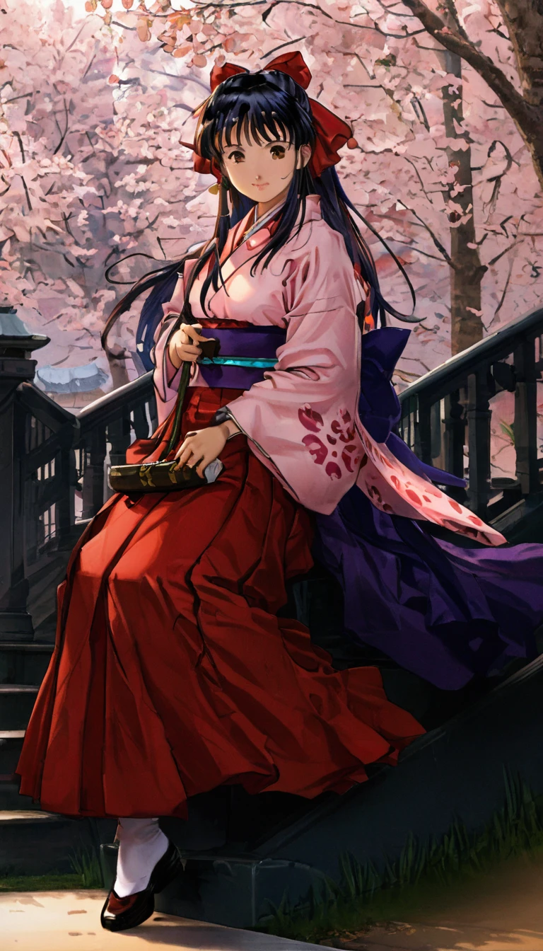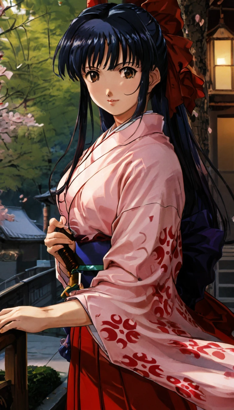召唤词: shinguuji sakura, red bow, dark blue hair, pink dress, Kimono