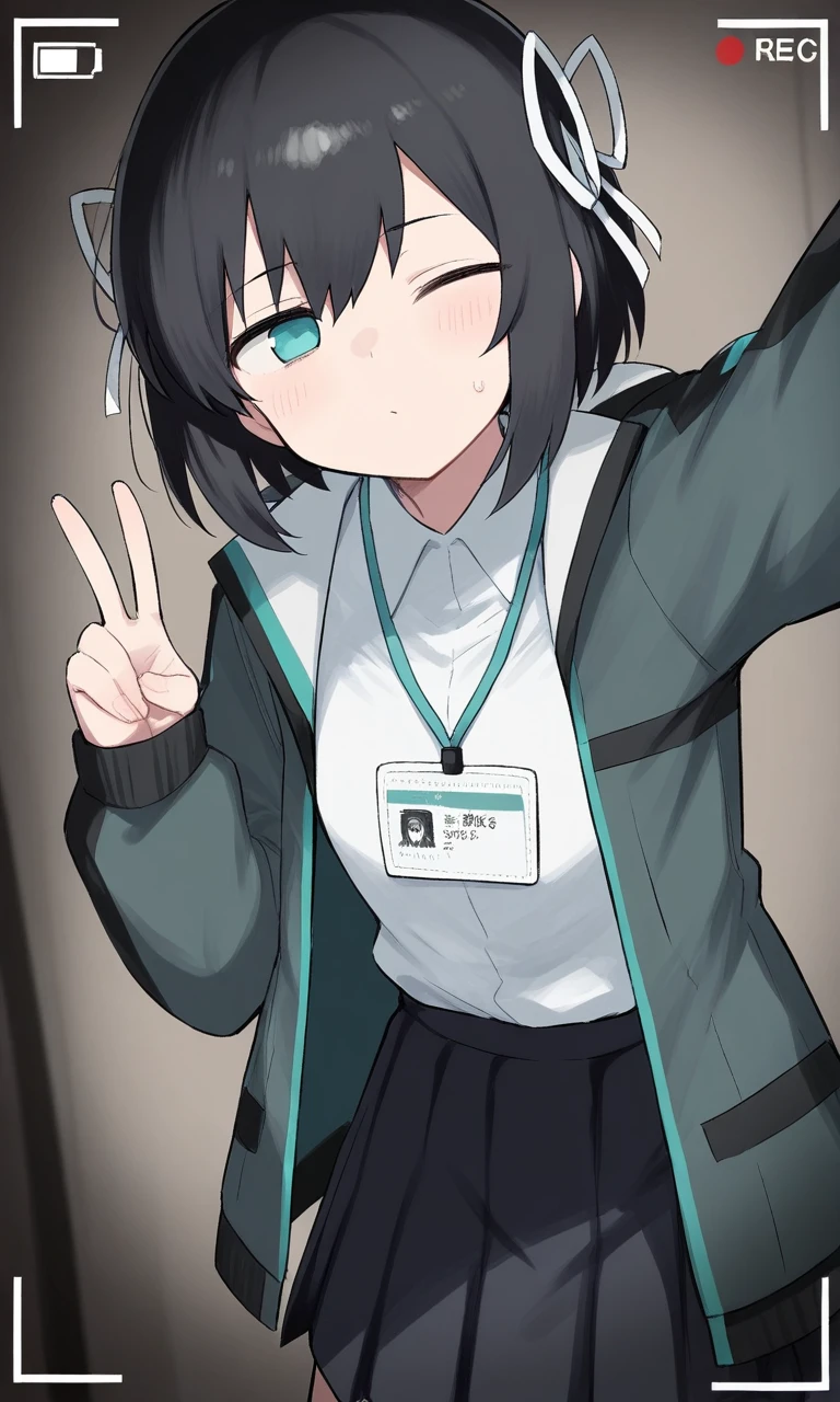 protagonist, black hair, aqua eyes, short hair, hair ribbon, 1girl, jacket, white shirt, id card, pleated skirt,