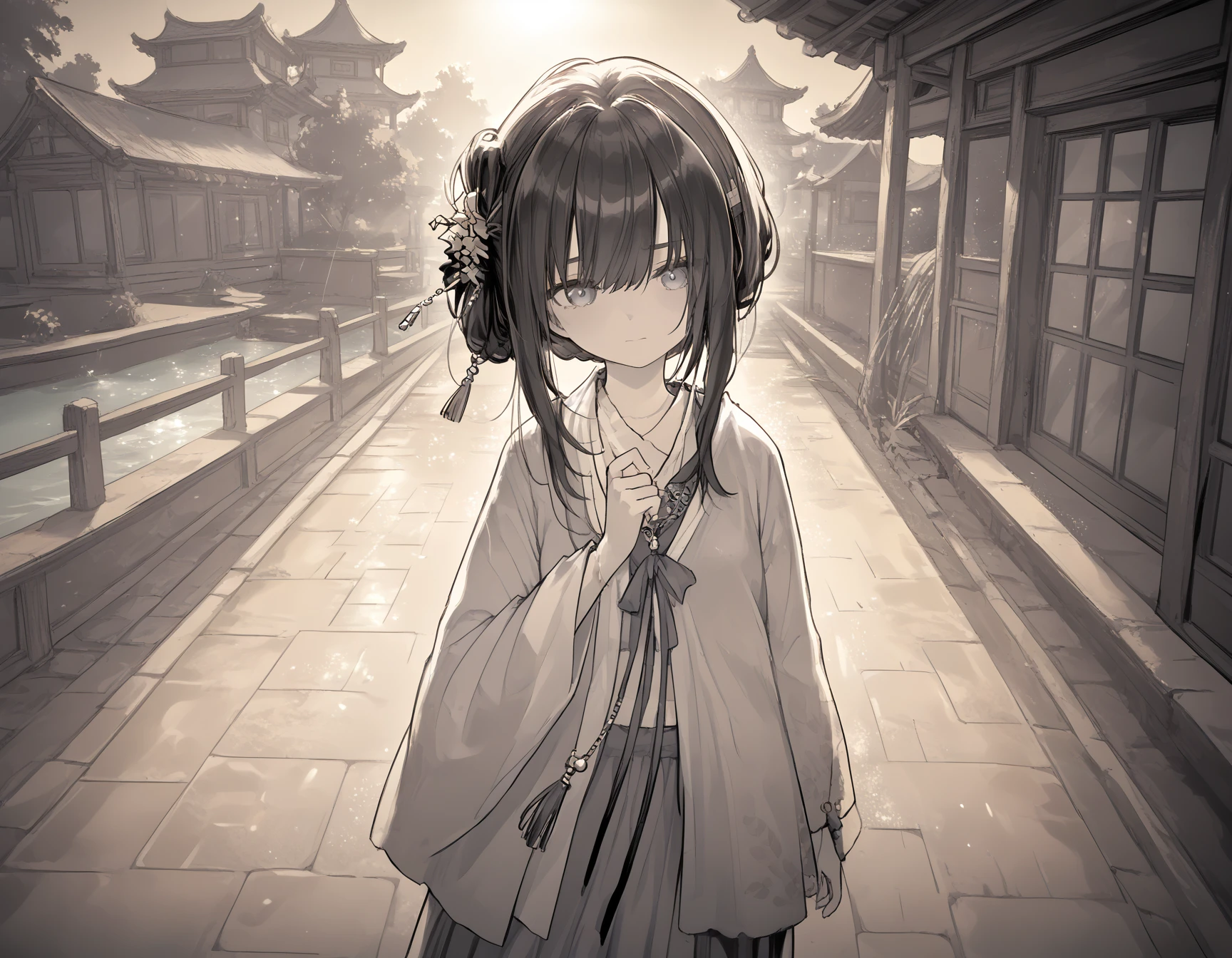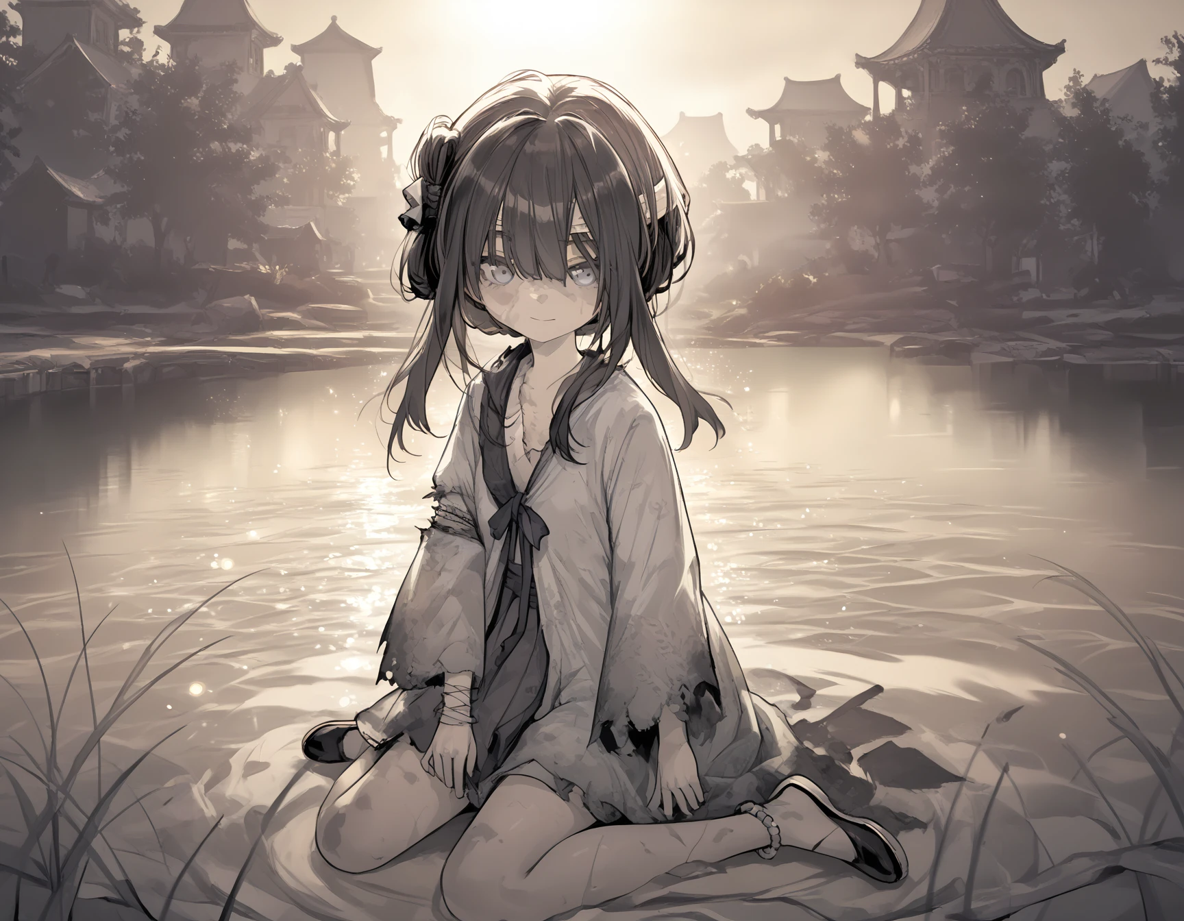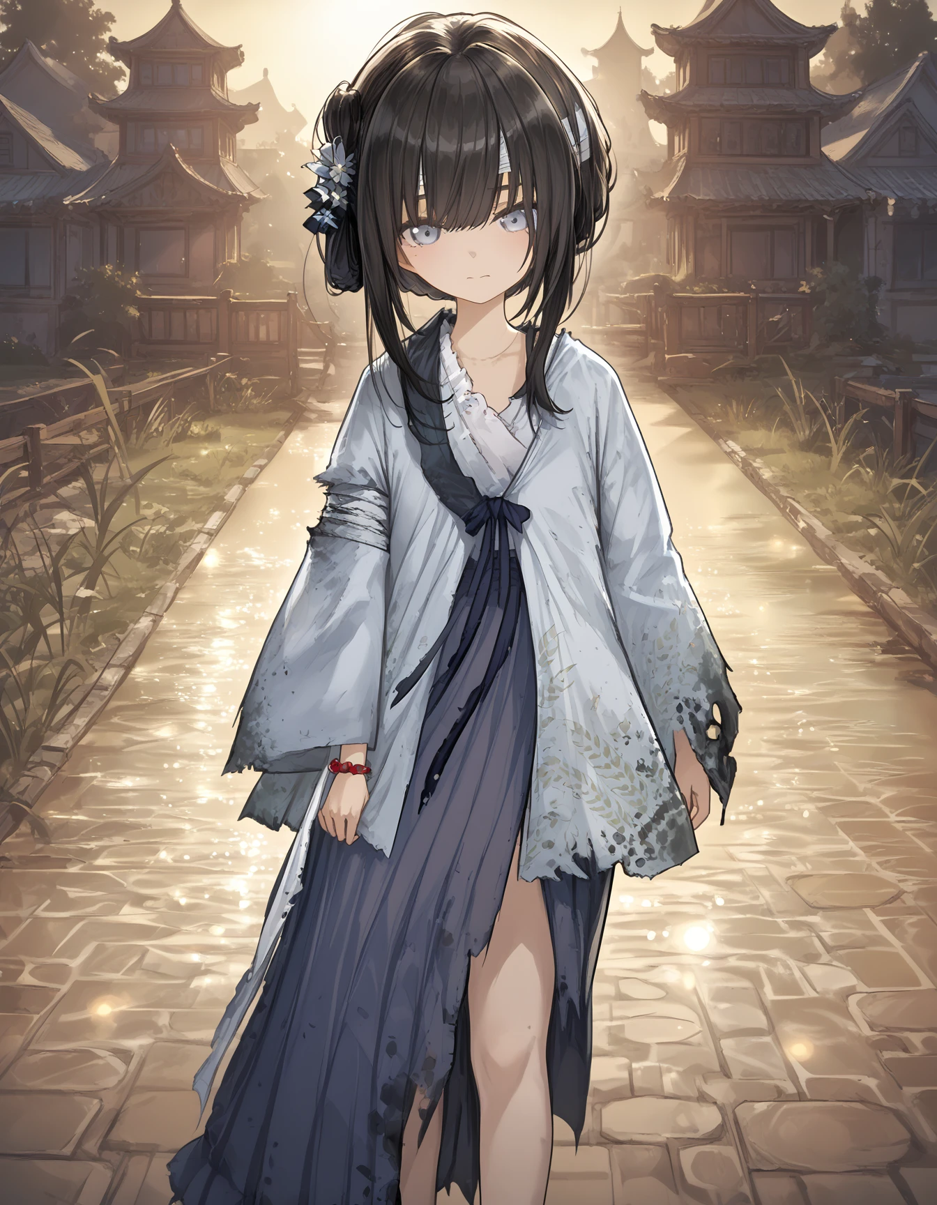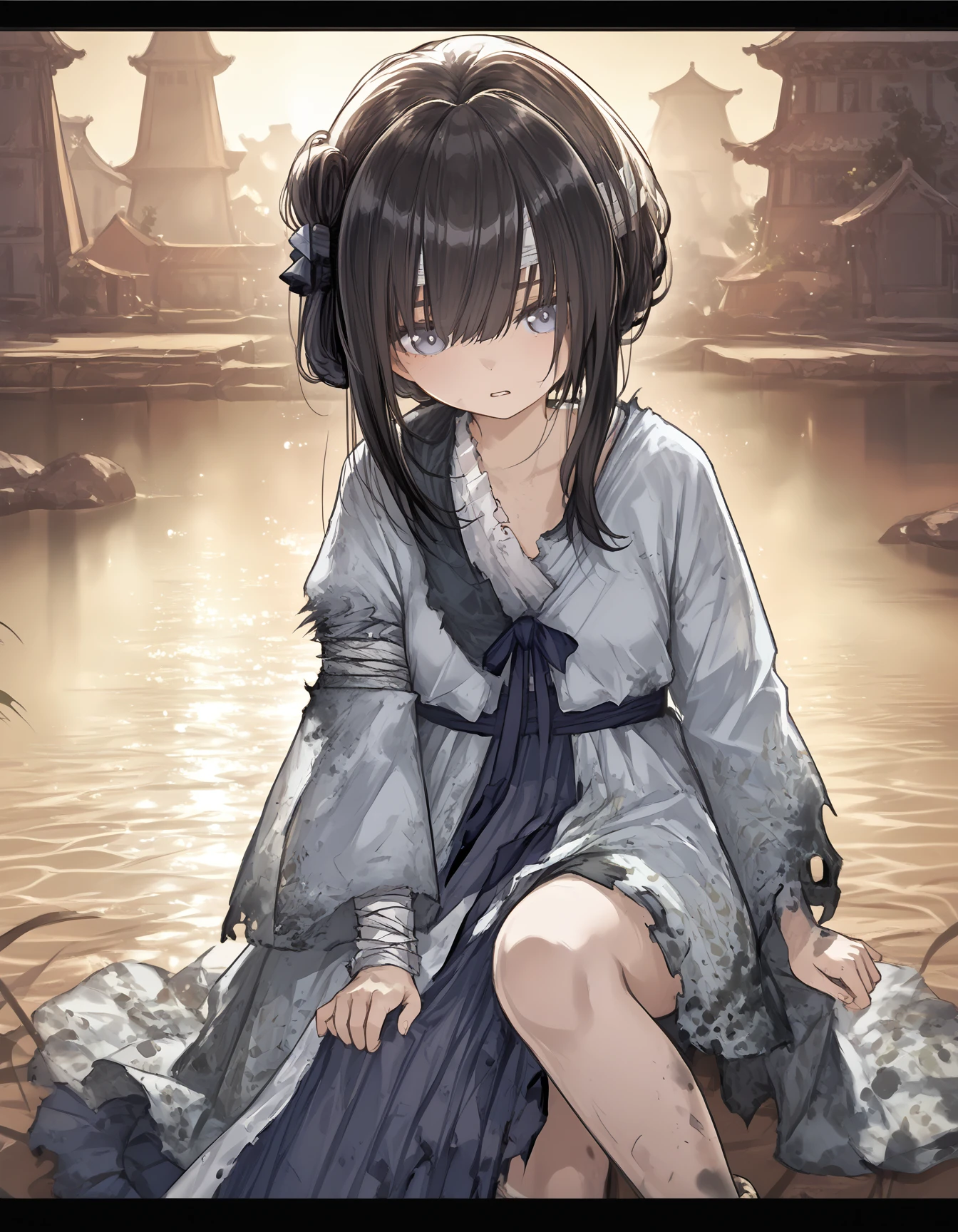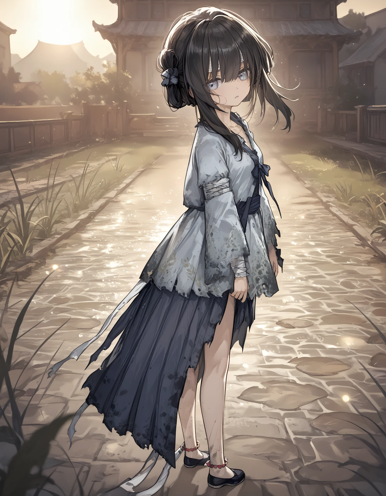 hl_sui, 1girl, blue eyes, grey eyes, mole under eye, black hair, long hair, single hair bun, bangs, hair between eyes, sidelocks, torn clothes, torn dress, chinese clothes, hanfu, dirty clothes, long sleeves, black footwear, bandaged arm, bandaged head, bandaged leg, anklet