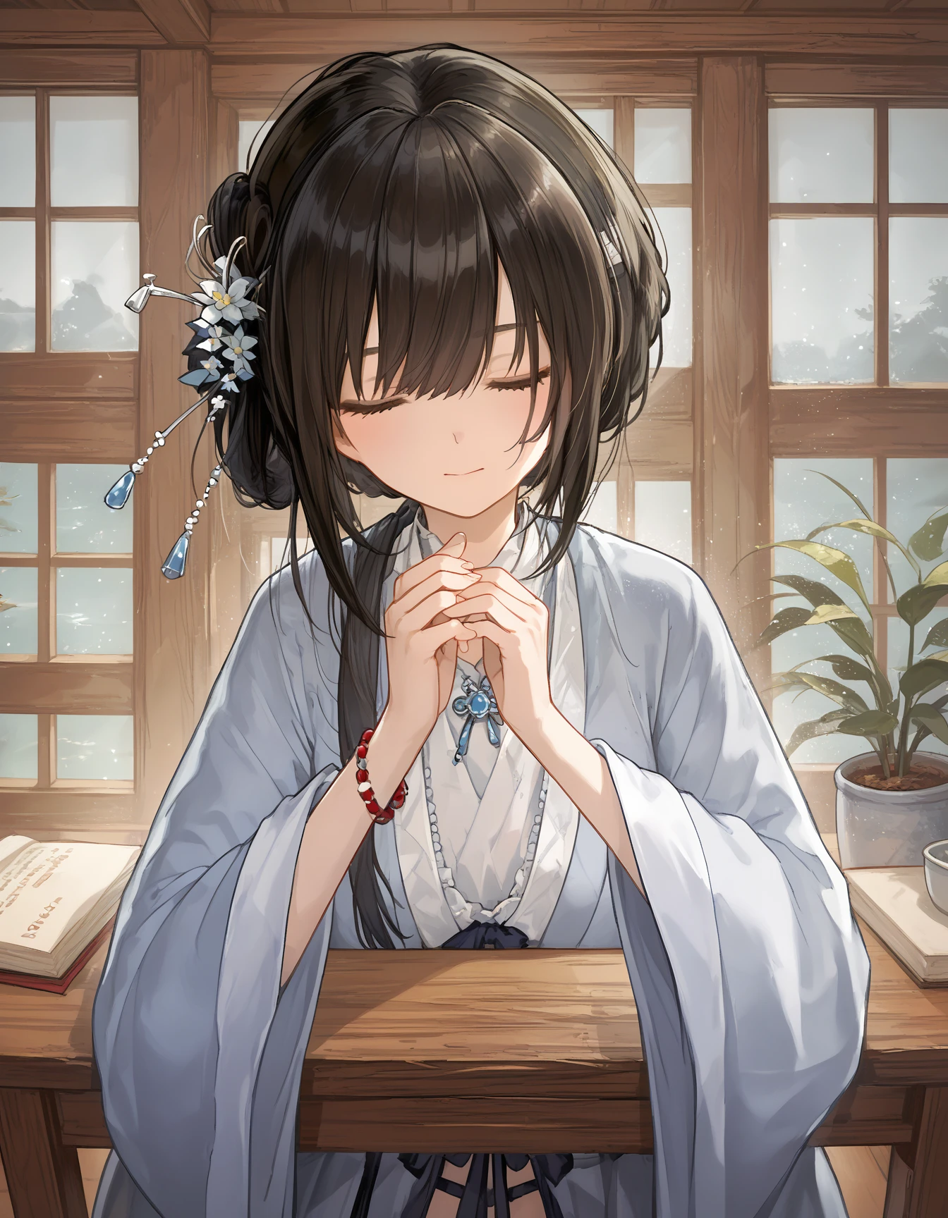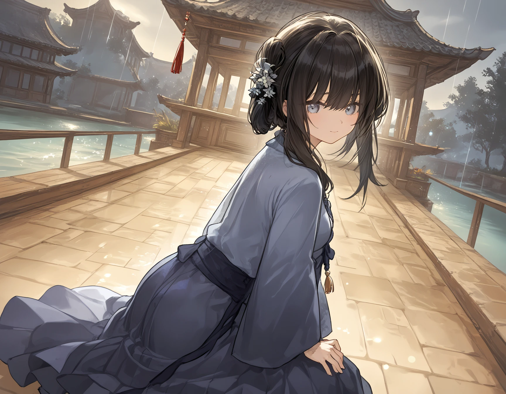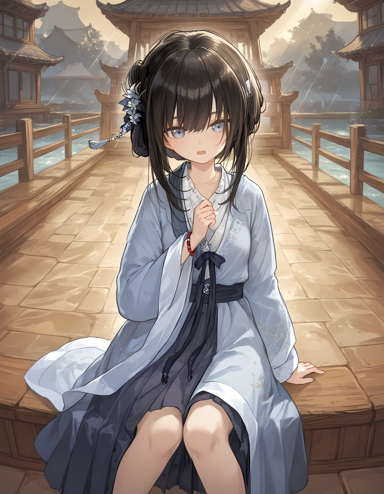 hl_sui, 1girl, blue eyes, grey eyes, mole under eye, black hair, long hair, single hair bun, bangs, hair between eyes, sidelocks, chinese clothes, hanfu, blue dress, long sleeves, wide sleeves, black footwear, hair flower, hair ornament, jewelry, braceletDescription