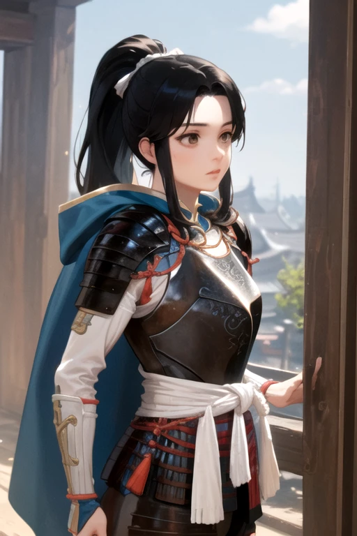 GinchiyoNioh, 1girl, solo, long hair, black hair, brown eyes, ponytail, blue cape, black armor, shoulder armor, japanese armor