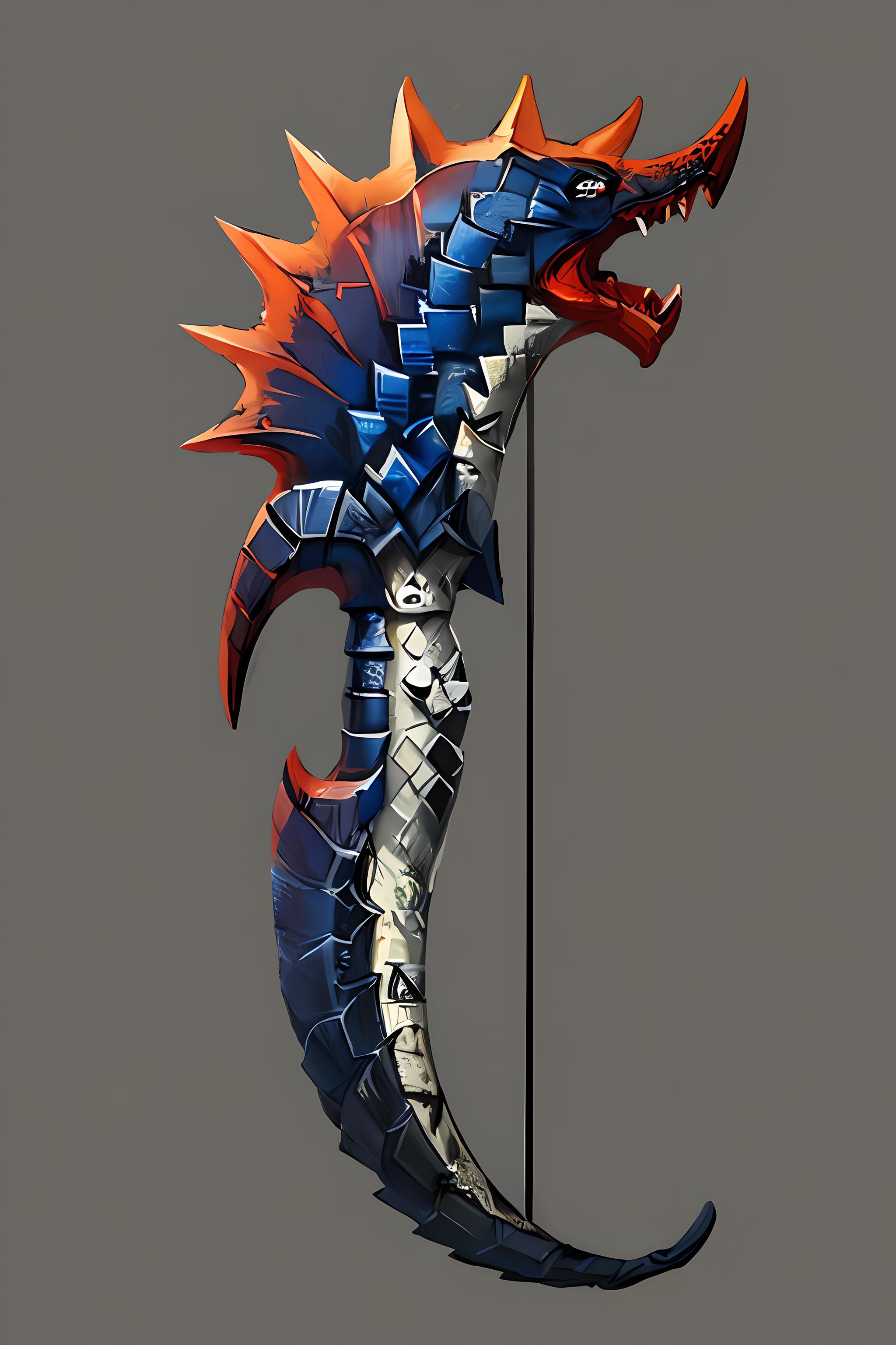 常用提示词:CGgameweaponicon dsw, black background, no humans, tail, simple background, horns, weapon, sword,gem, shiny,crystal, weapon, sword, still life, bow \(weapon\), arrow \(projectile\), still life, glowing, monster,wings, monster, from side, dragon, teeth