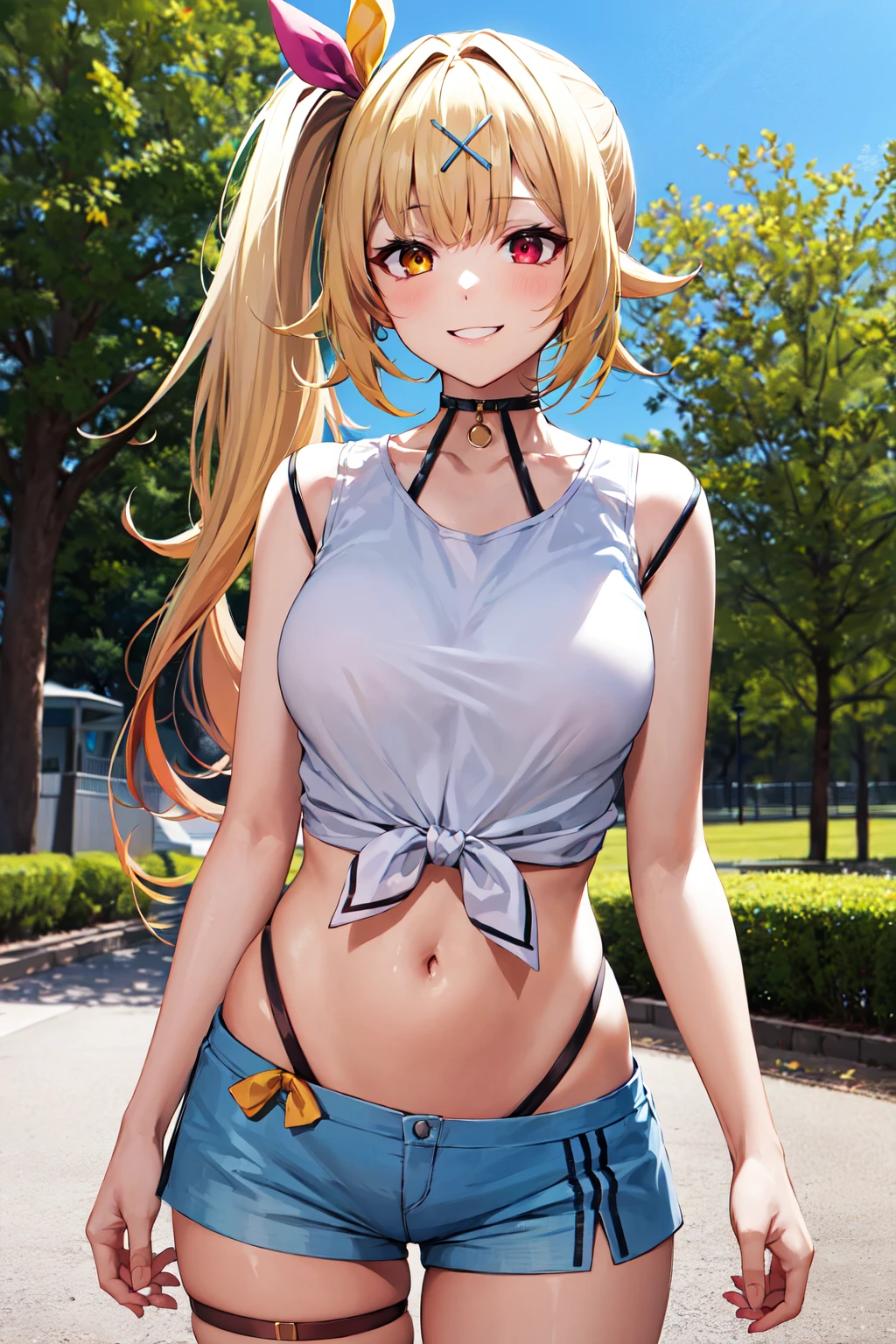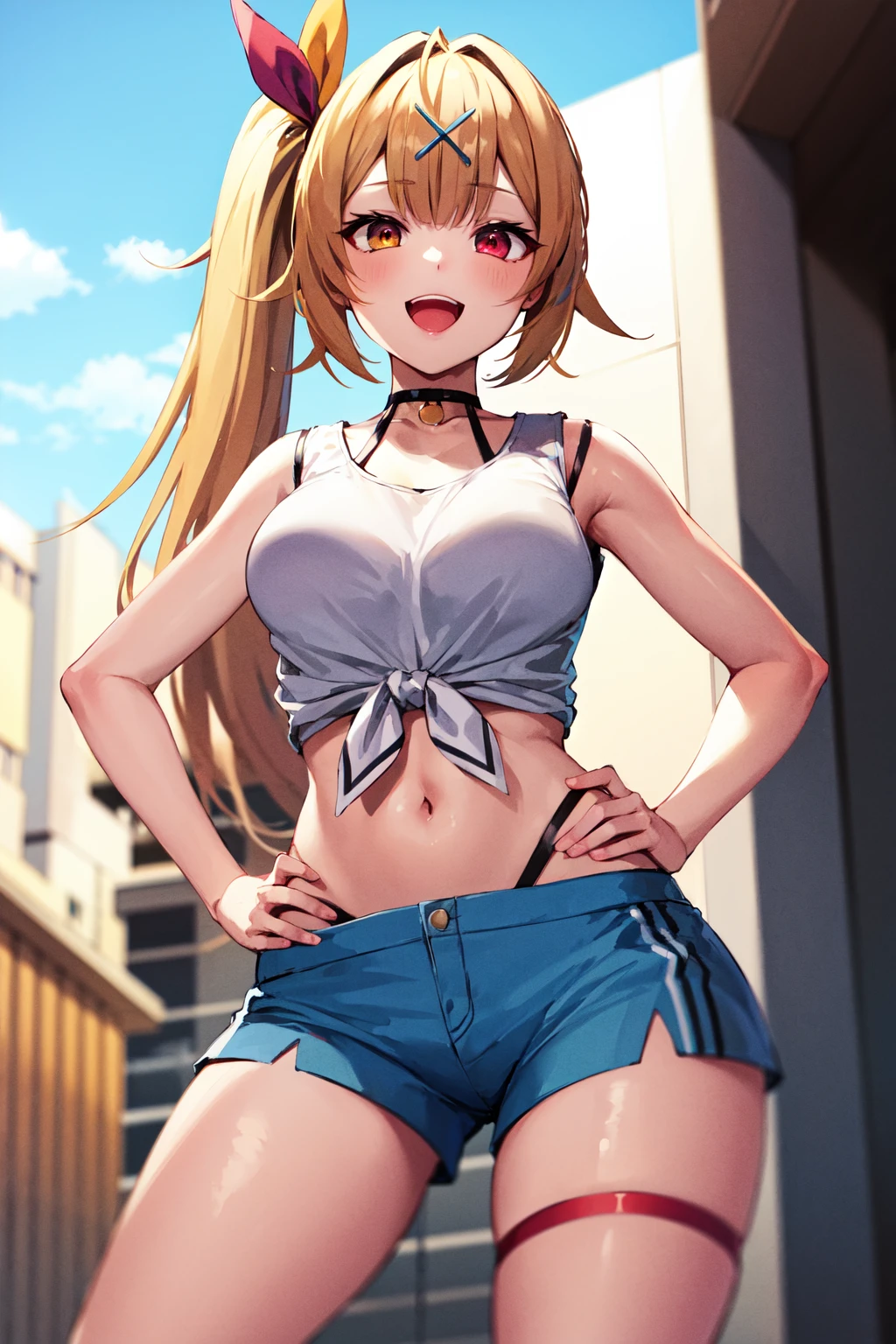 outfit A (Without Jacket)hs1, red eyes, yellow eyes, side ponytail, x hair ornament, thigh strap, blue shorts, front-tie top, hair ribbon, midriff, panty straps, sleeveless, white shirt, black choker