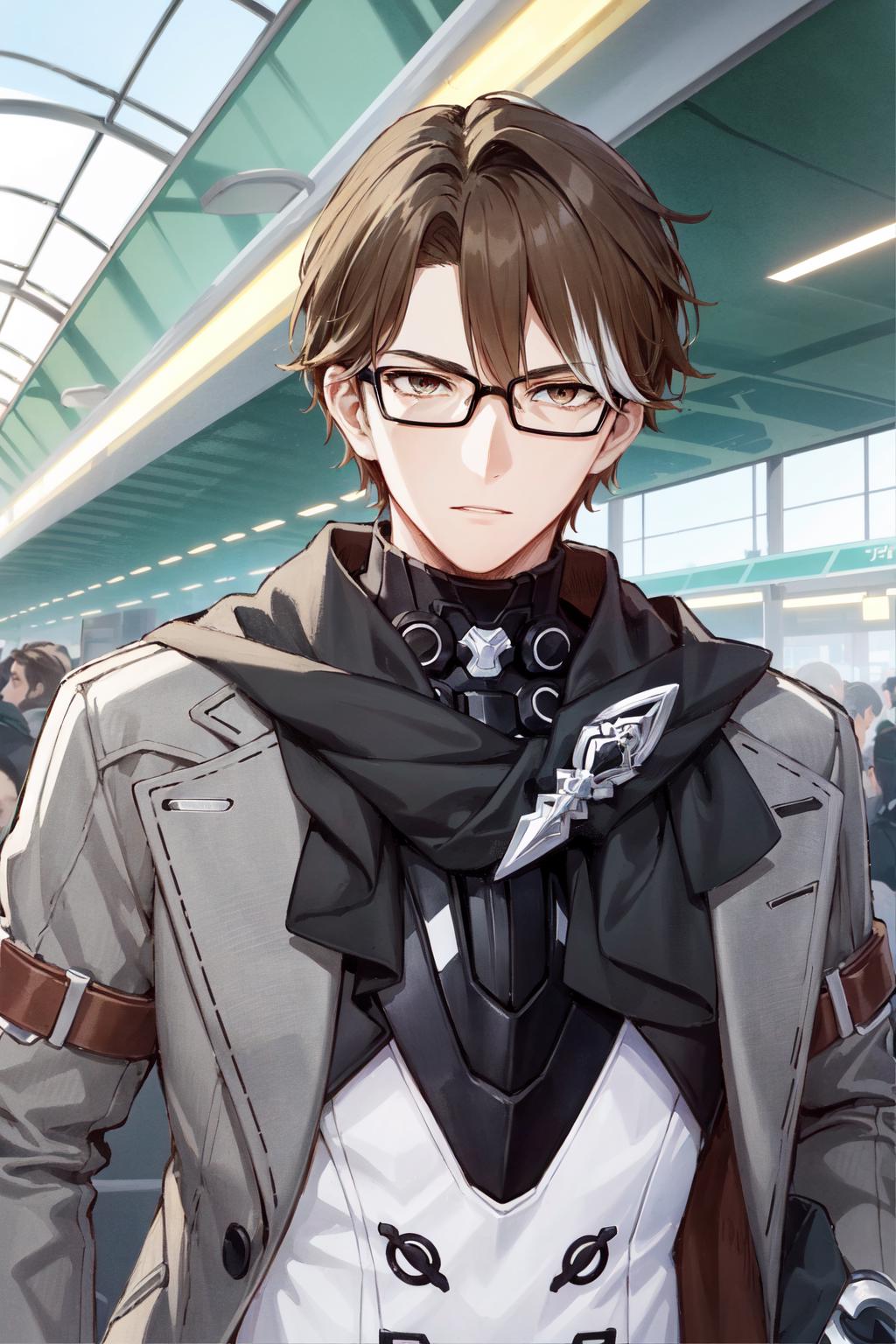 optional tags: male focus, glasses, grey coat, brown scarf, white shirt, multicolored hair, brown hair,