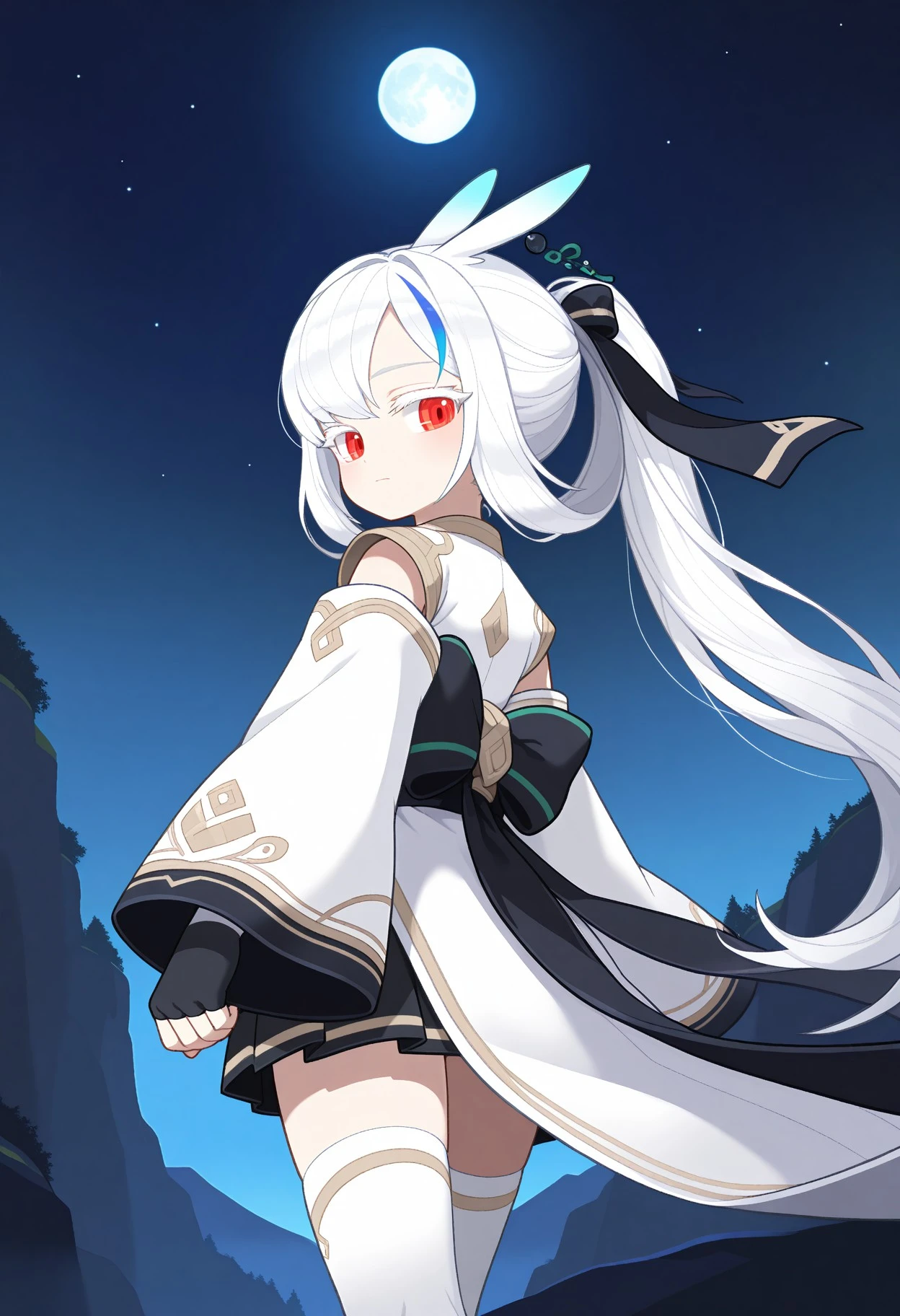ren_\(maplestory\), white hair, streaked hair, blue hair, high ponytail, red eyes, white eyebrows, white eyelash, hair bow, hair ribbon,