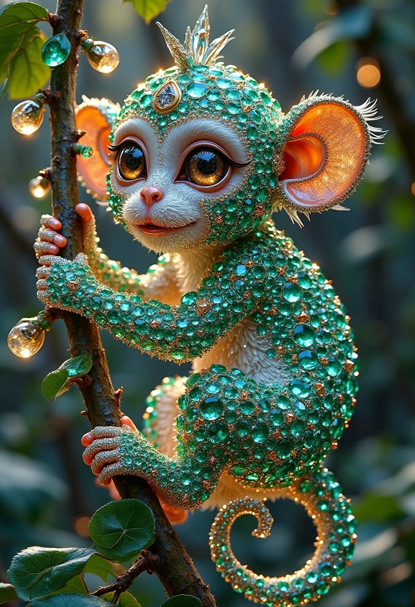 Shiny and decorated with jewels, a monkey swings from a gem - laden vine, fur studded with emerald beads, eyes shining like diamond stars.