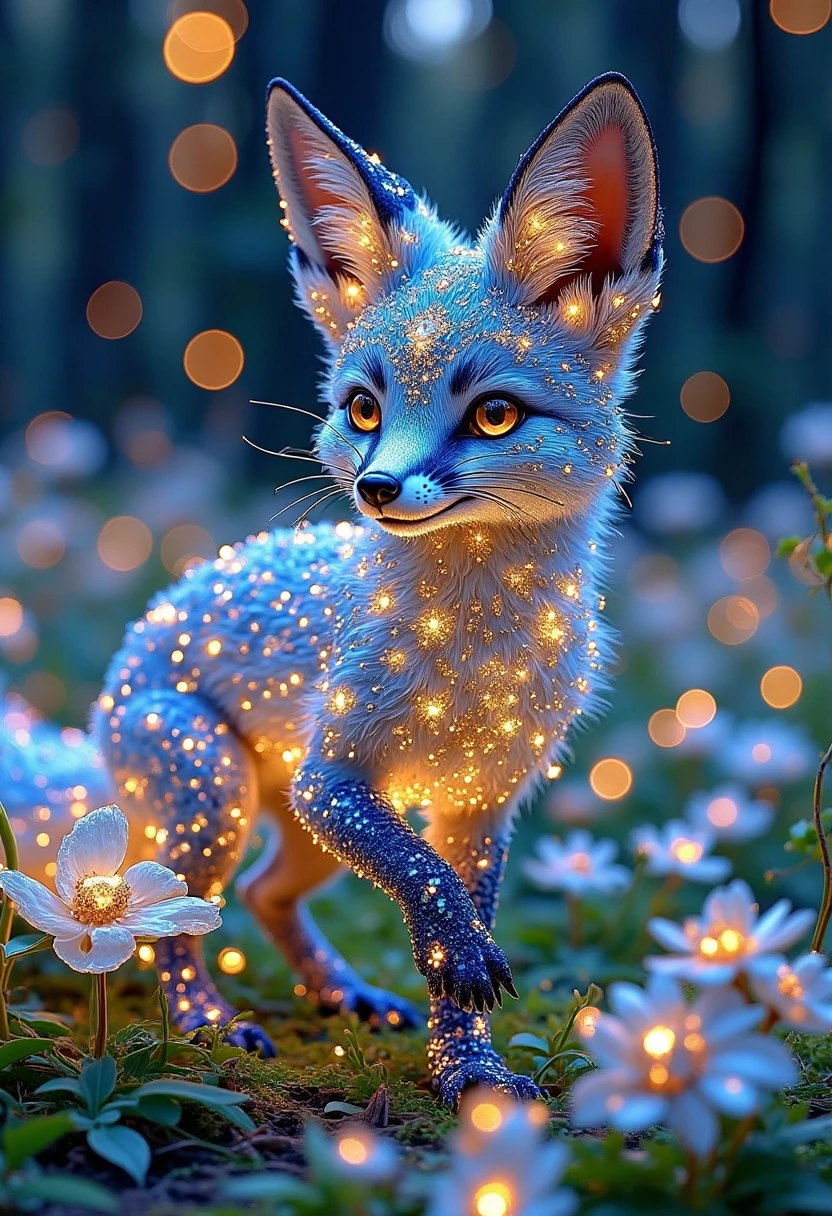 Shiny and decorated with jewels, a fox roams a moonlit meadow, paws leaving trails of stardust, coat adorned with ruby - like spots.