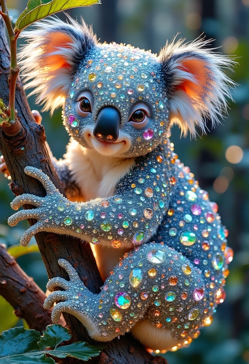 Shiny and decorated with jewels, a koala rests on a gem - studded eucalyptus, fur dotted with opal specks, paws gripping diamond - like leaves.