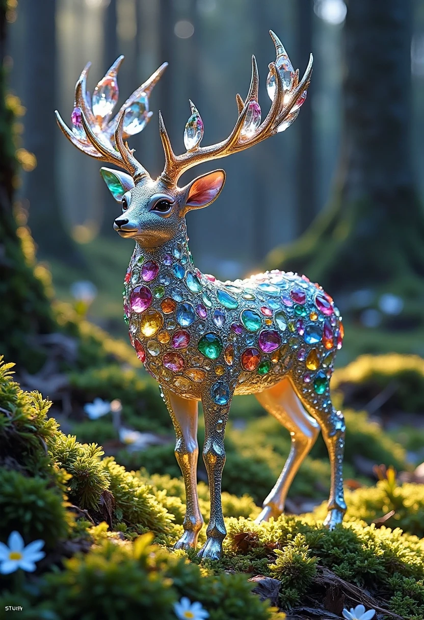 Shiny and decorated with jewels, a deer stands in an enchanted forest, its antlers glistening like diamond branches, fur shimmering with gem - like hues.