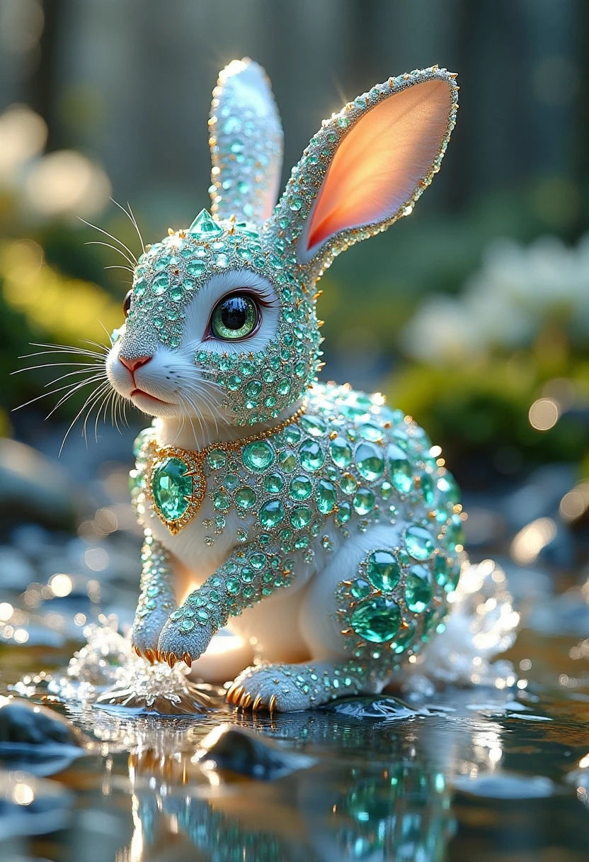 Shiny and decorated with jewels, a rabbit hops by a crystal stream, ears twinkling with sapphire studs, eyes reflecting emerald light.