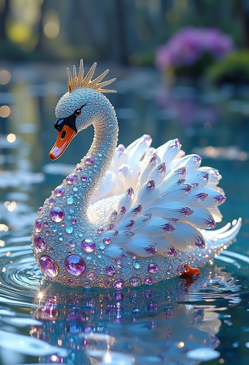 Shiny and decorated with jewels, a swan glides on a jeweled lake, feathers dripping with diamond dew, beak edged in amethyst.