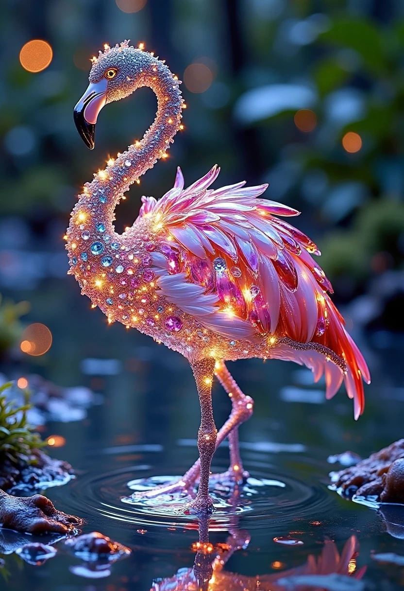 Shiny and decorated with jewels, a flamingo stands in a jeweled wetland, feathers glowing like ruby flames, legs shimmering with crystal sheen.