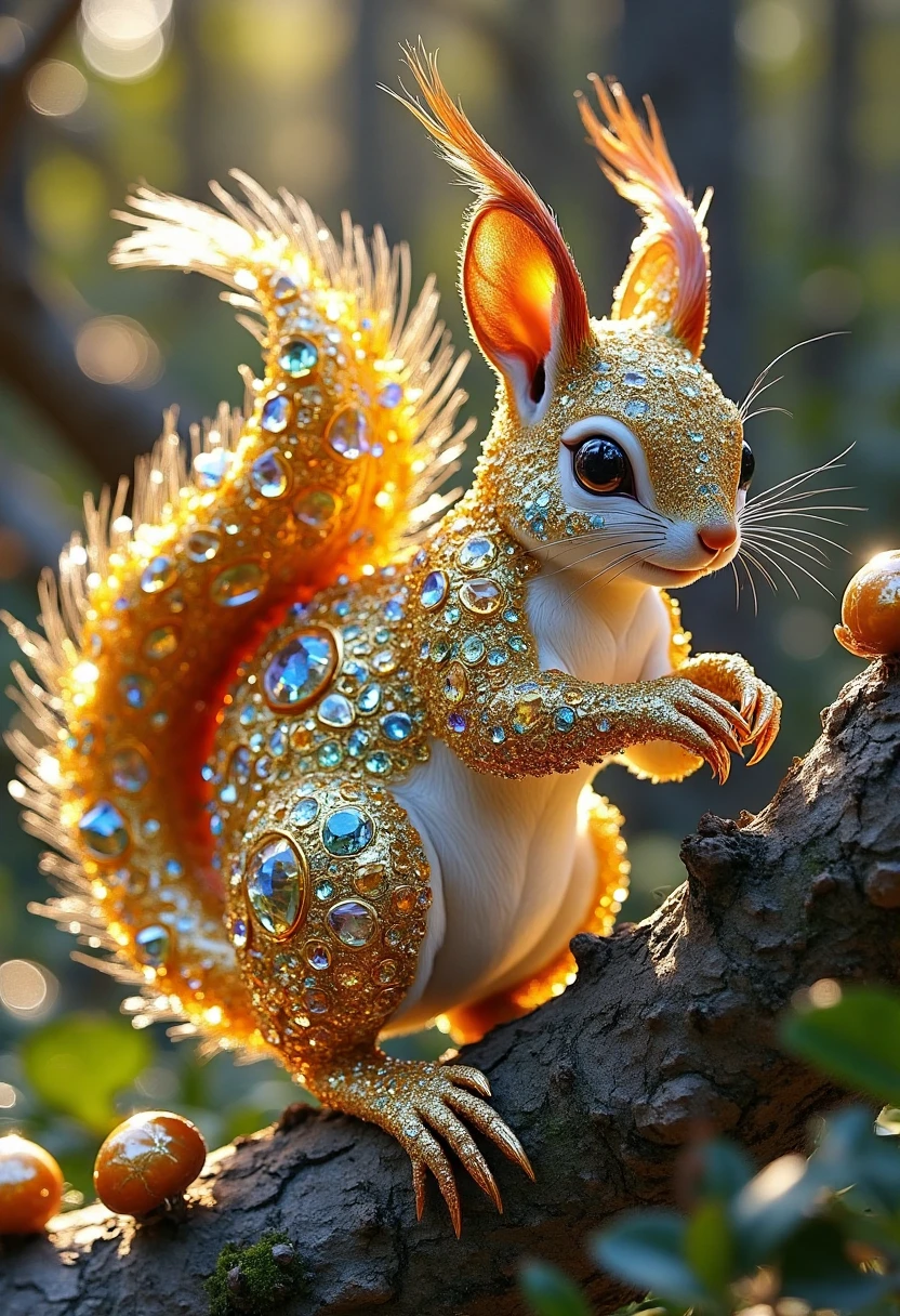 Shiny and decorated with jewels, a squirrel climbs a golden oak, tail bristling with topaz shards, nuts glimmering like pearl orbs.