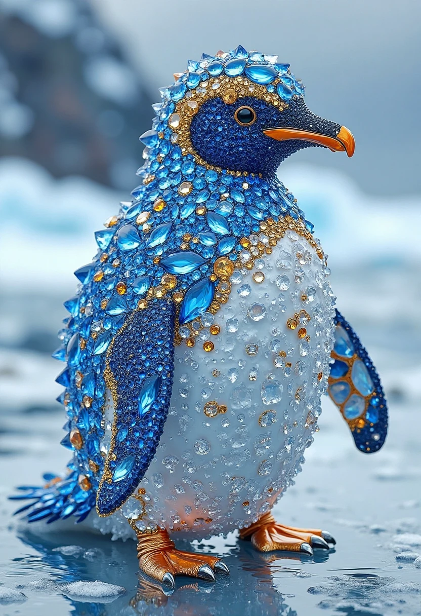 Shiny and decorated with jewels, a penguin waddles on an icy shore, feathers encrusted with sapphire flakes, beak lined with gold - like jewels.