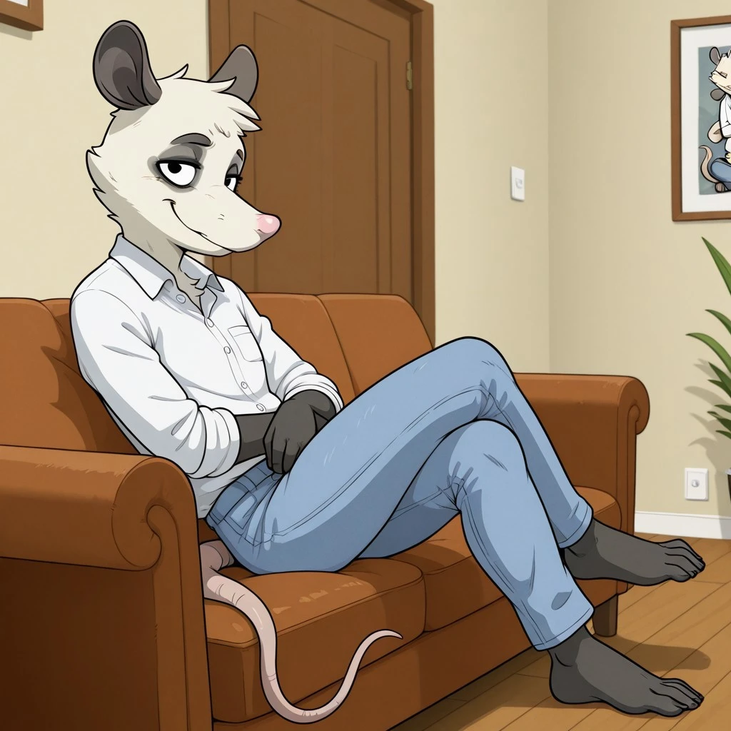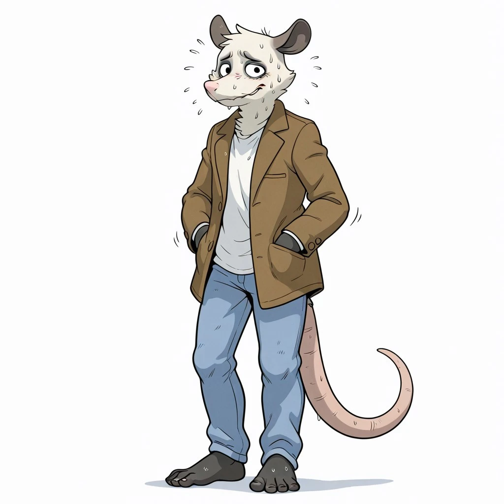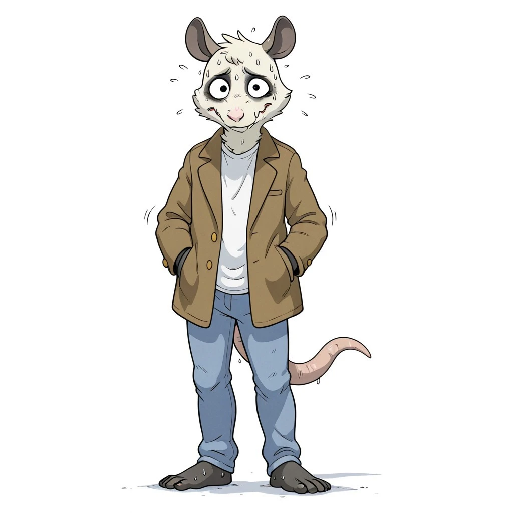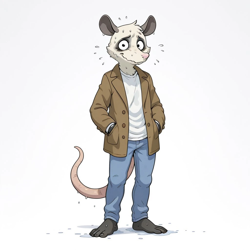Possum, American opossum, white fur, black eyes, pink nose, possum ears, black hands, black feet, Possum tail,