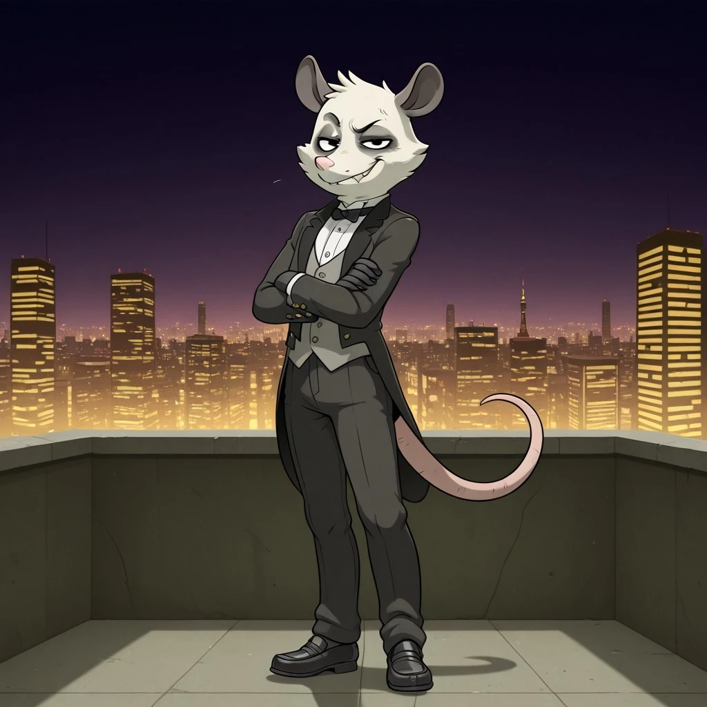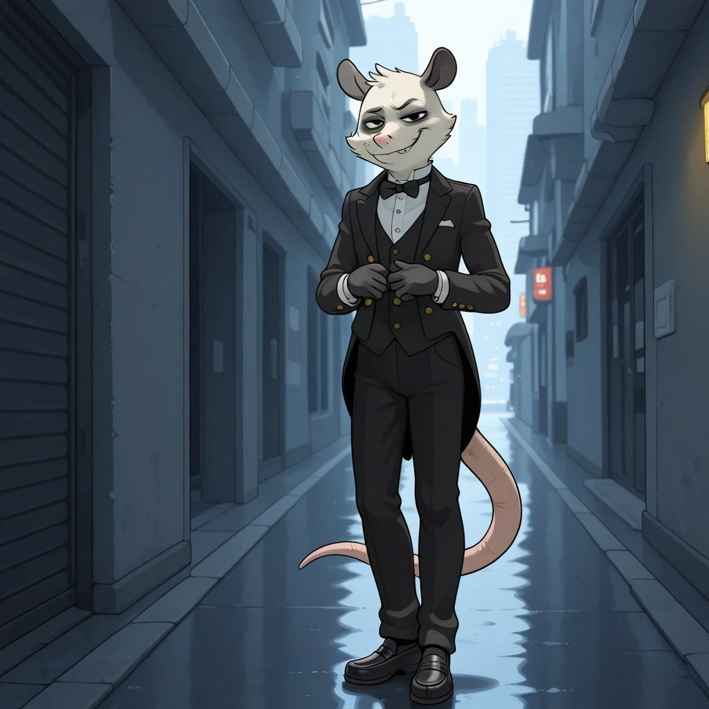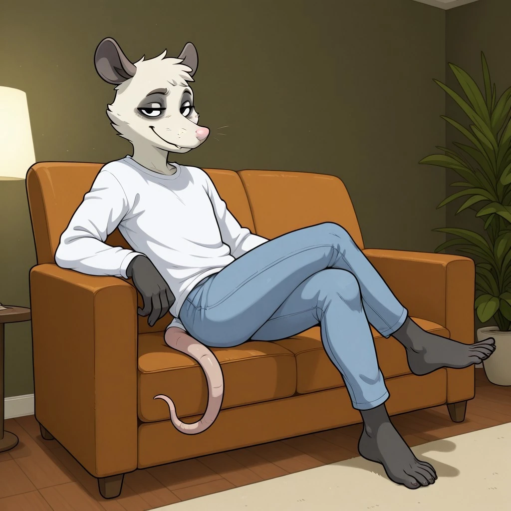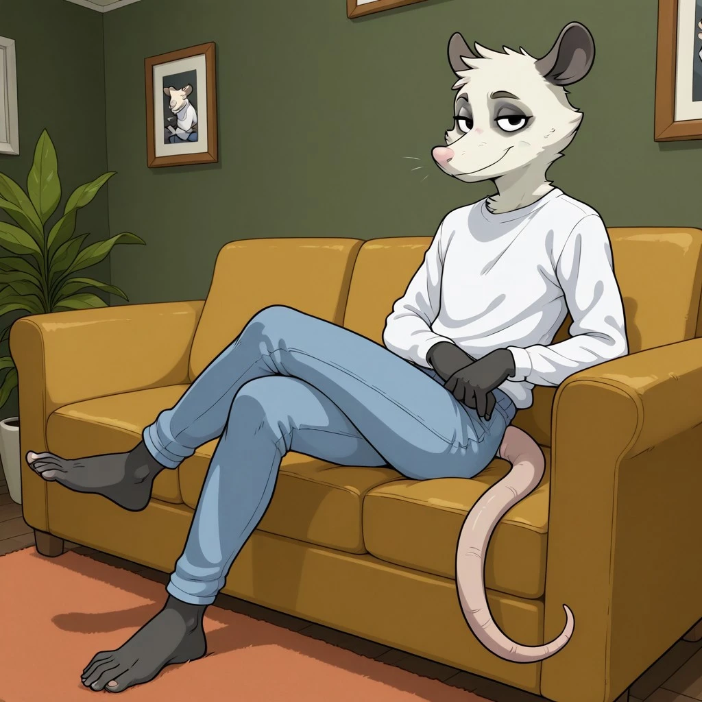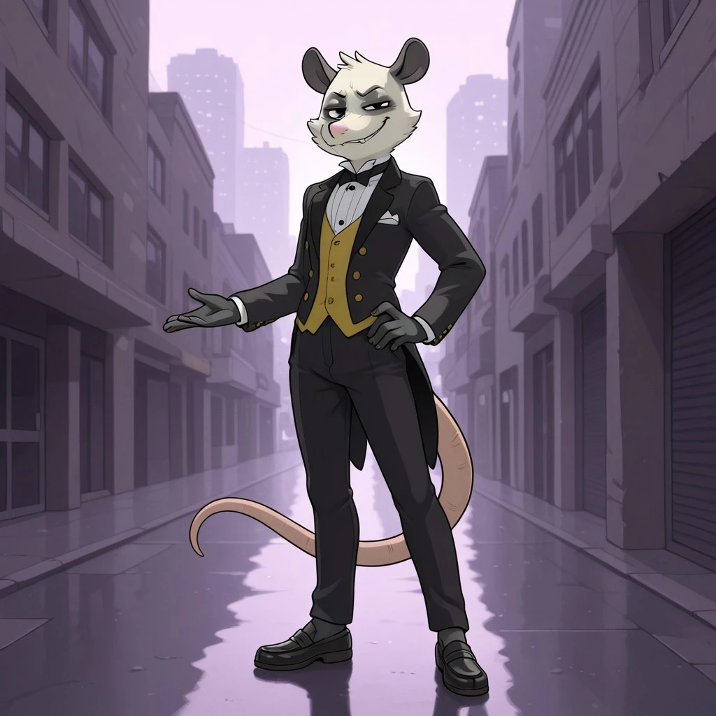 Possum, American opossum, white fur, black eyes, pink nose, possum ears, black hands, black feet, Possum tail,