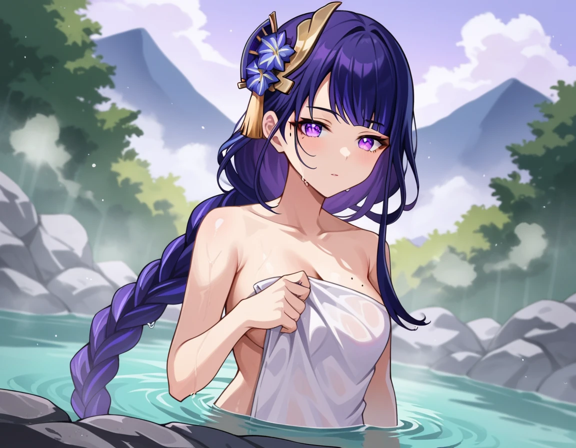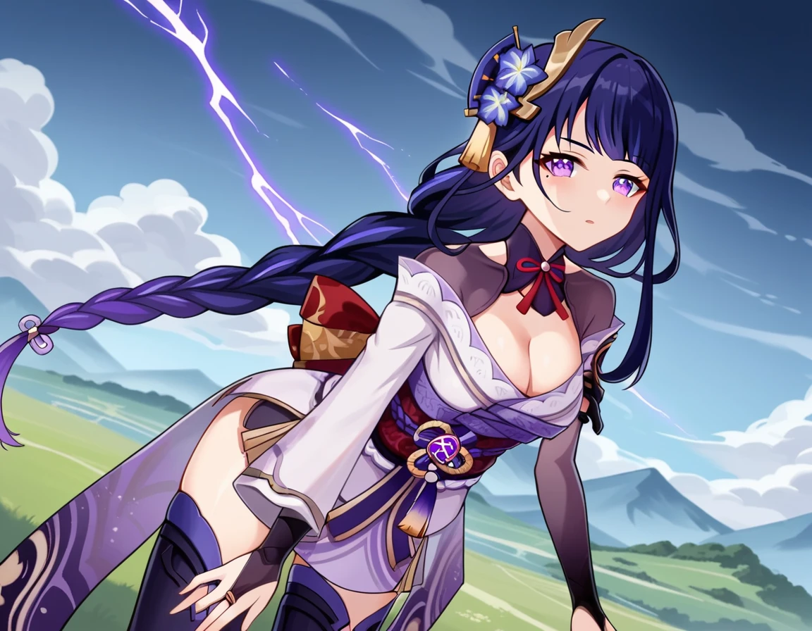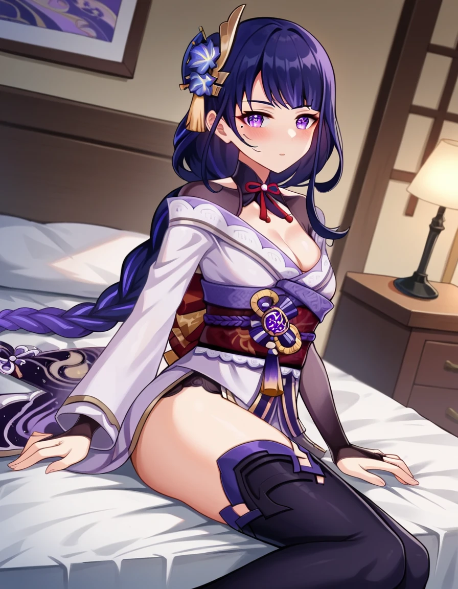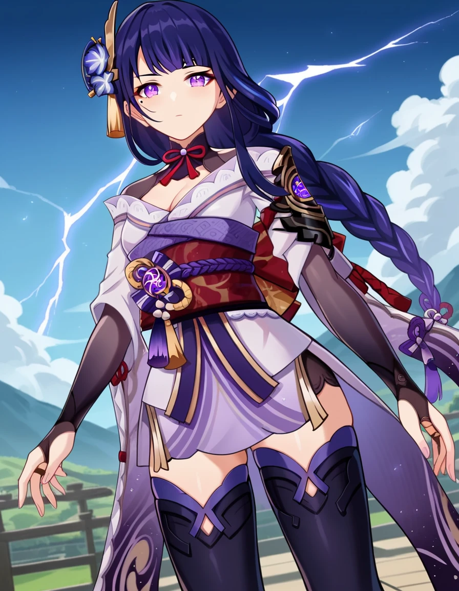 raiden shogun, braid, braided ponytail, hair flower, hair ornament, long hair, mole, mole under eye, purple eyes, purple flower, purple hair, single braid, sidelocks,