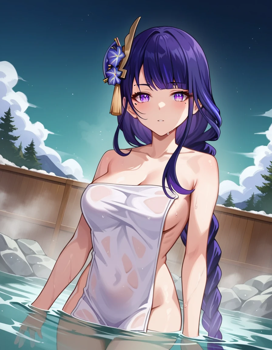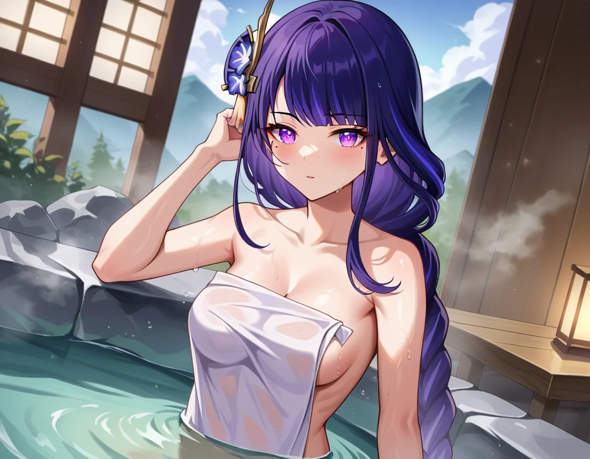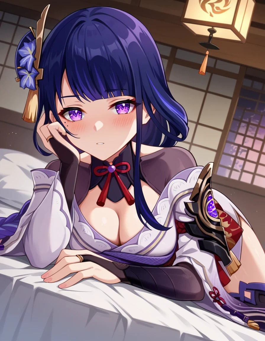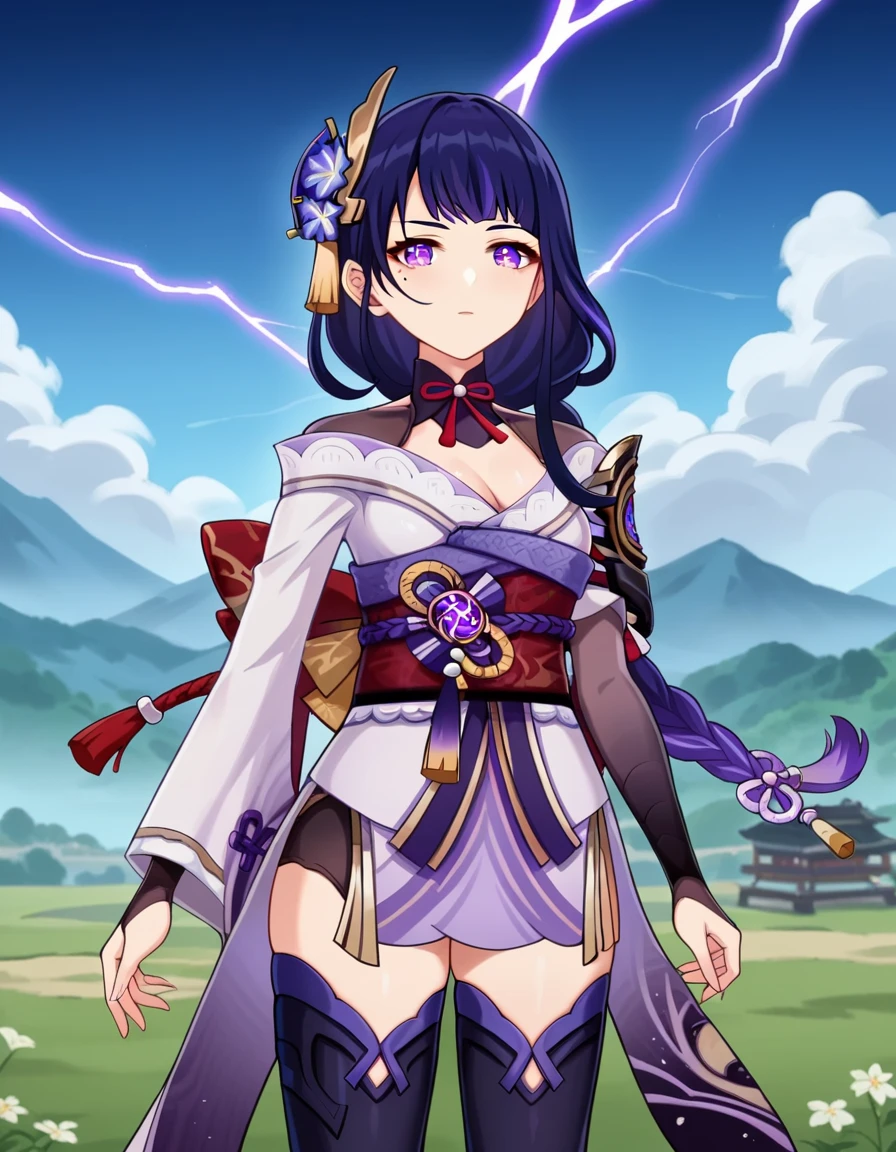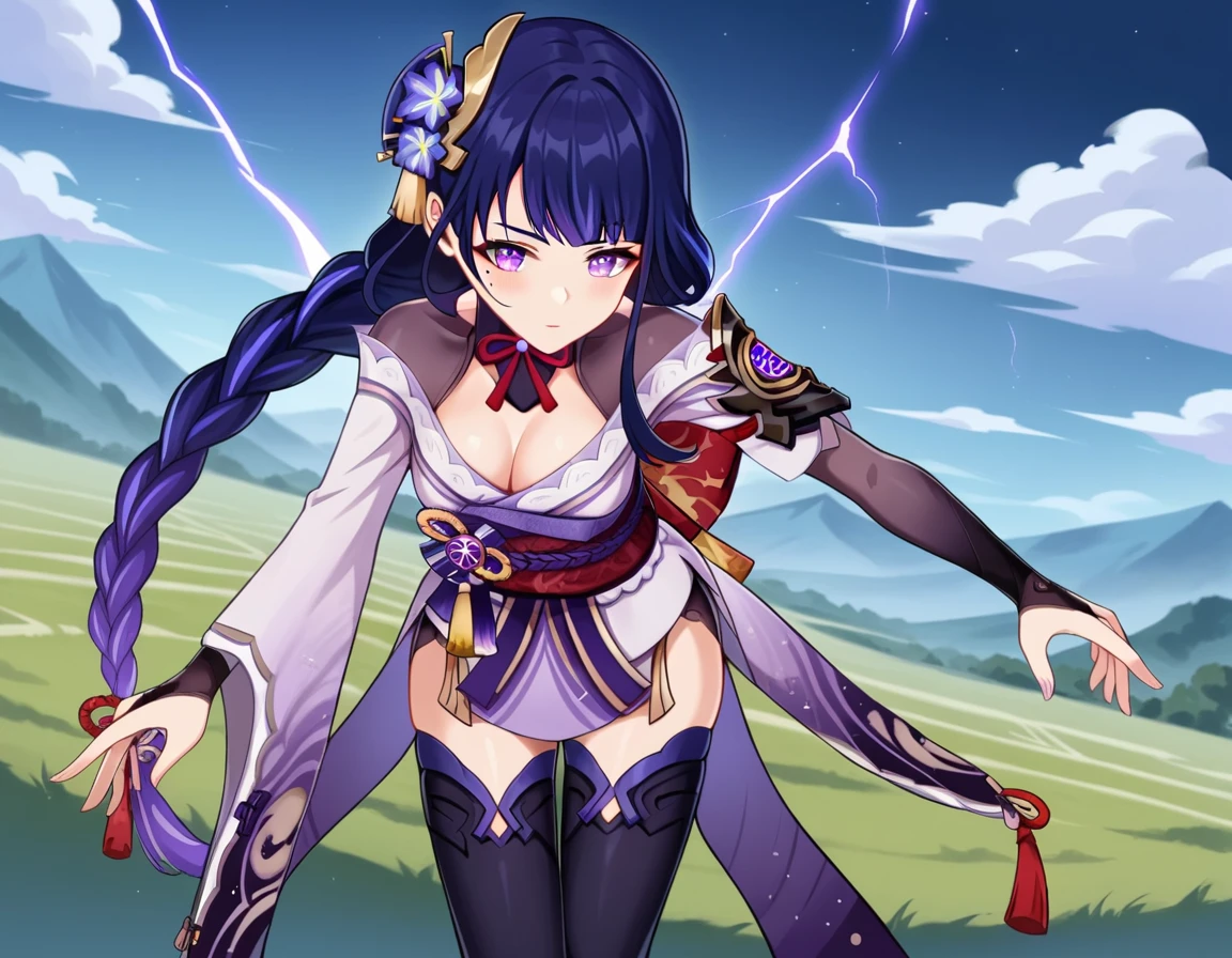raiden shogun, braid, braided ponytail, hair flower, hair ornament, long hair, mole, mole under eye, purple eyes, purple flower, purple hair, single braid, sidelocks,