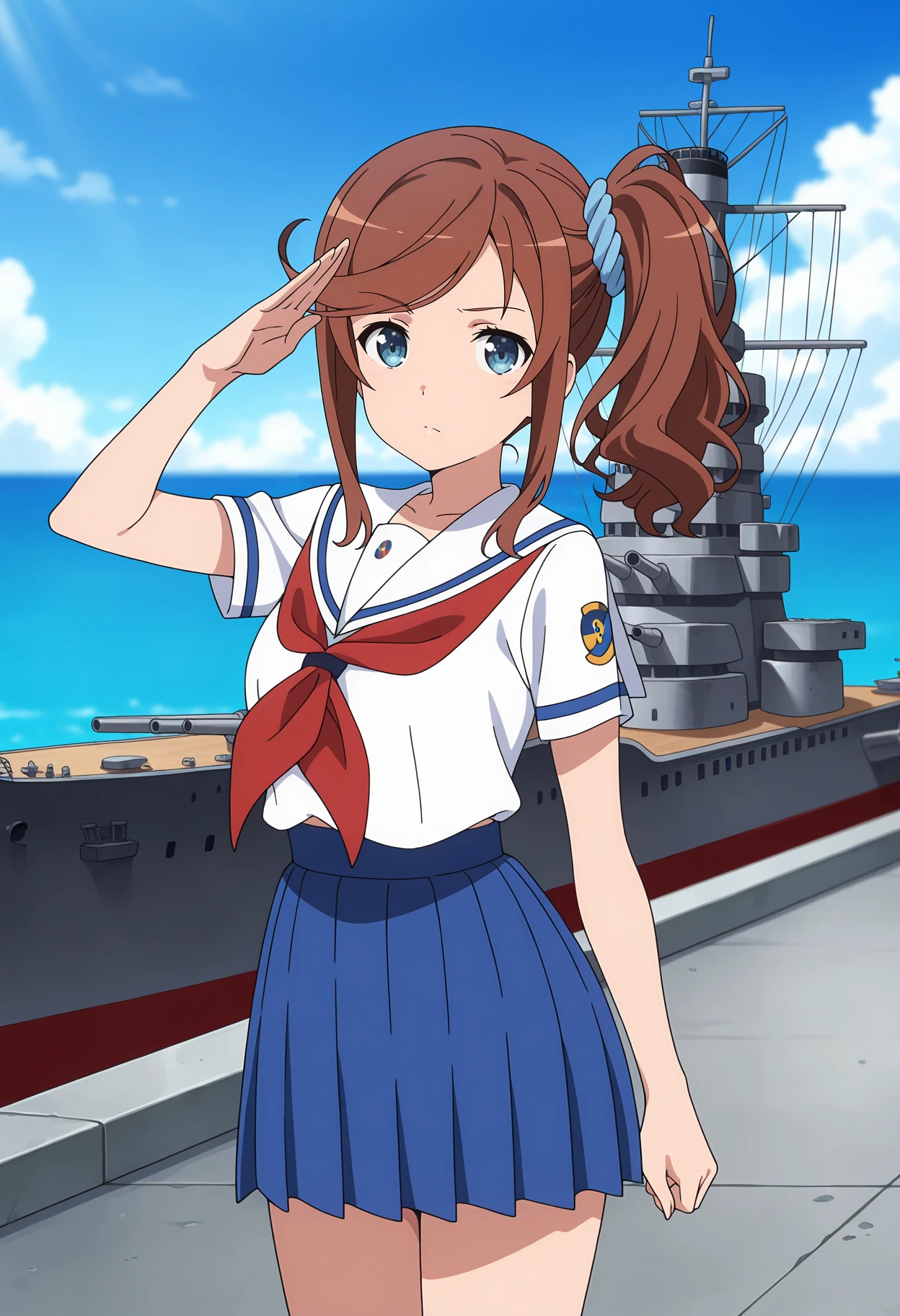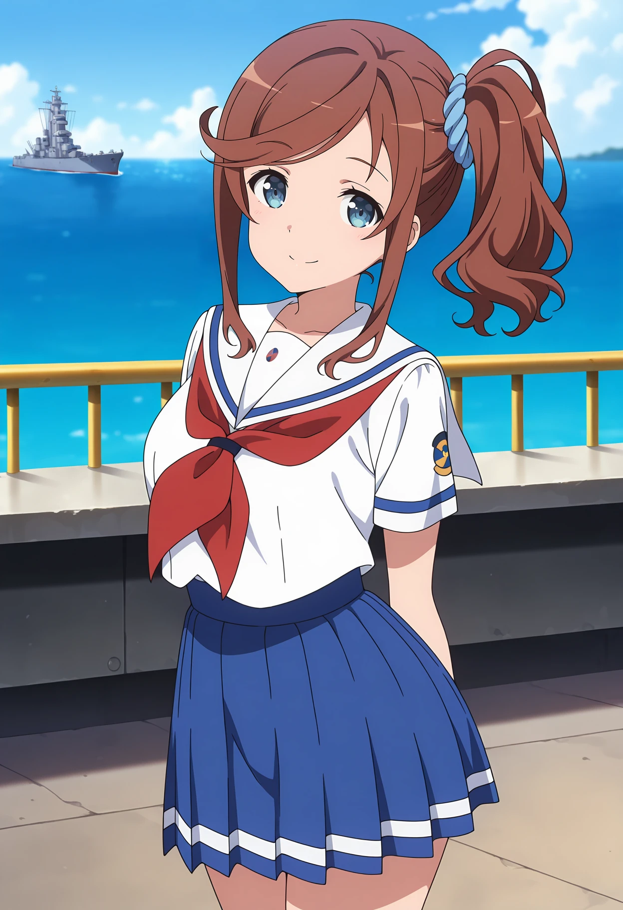 side ponytail, swept bangs, brown hair, blue eyes, hair scrunchie, blue scrunchie, white sailor collar, white shirt, red neckerchief, short sleeves, pleated skirt, blue skirt