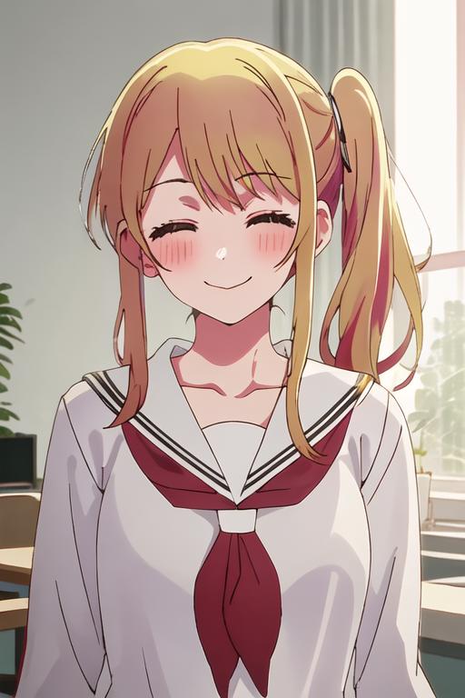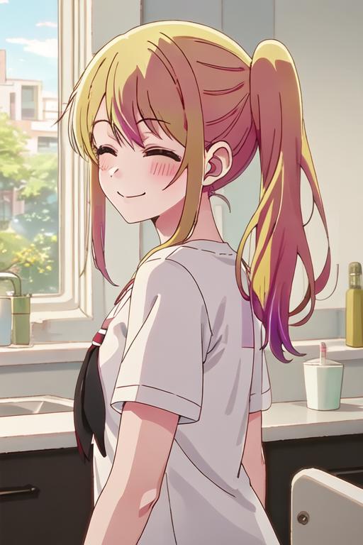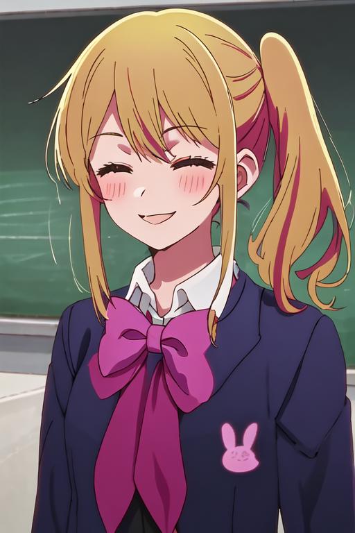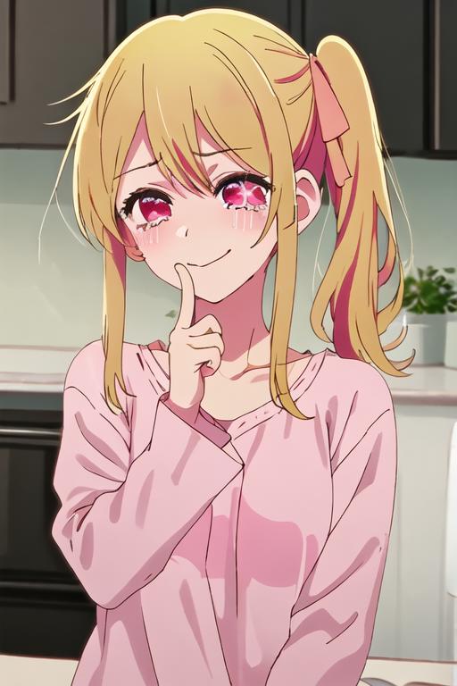 The trigger word is ruby_oshinoko, and the recommended tags are best quality, masterpiece, highres, solo, {ruby_oshinoko:1.15}, blonde_hair, bangs, long_hair, blush, closed_mouth, smile, closed_eyes.
