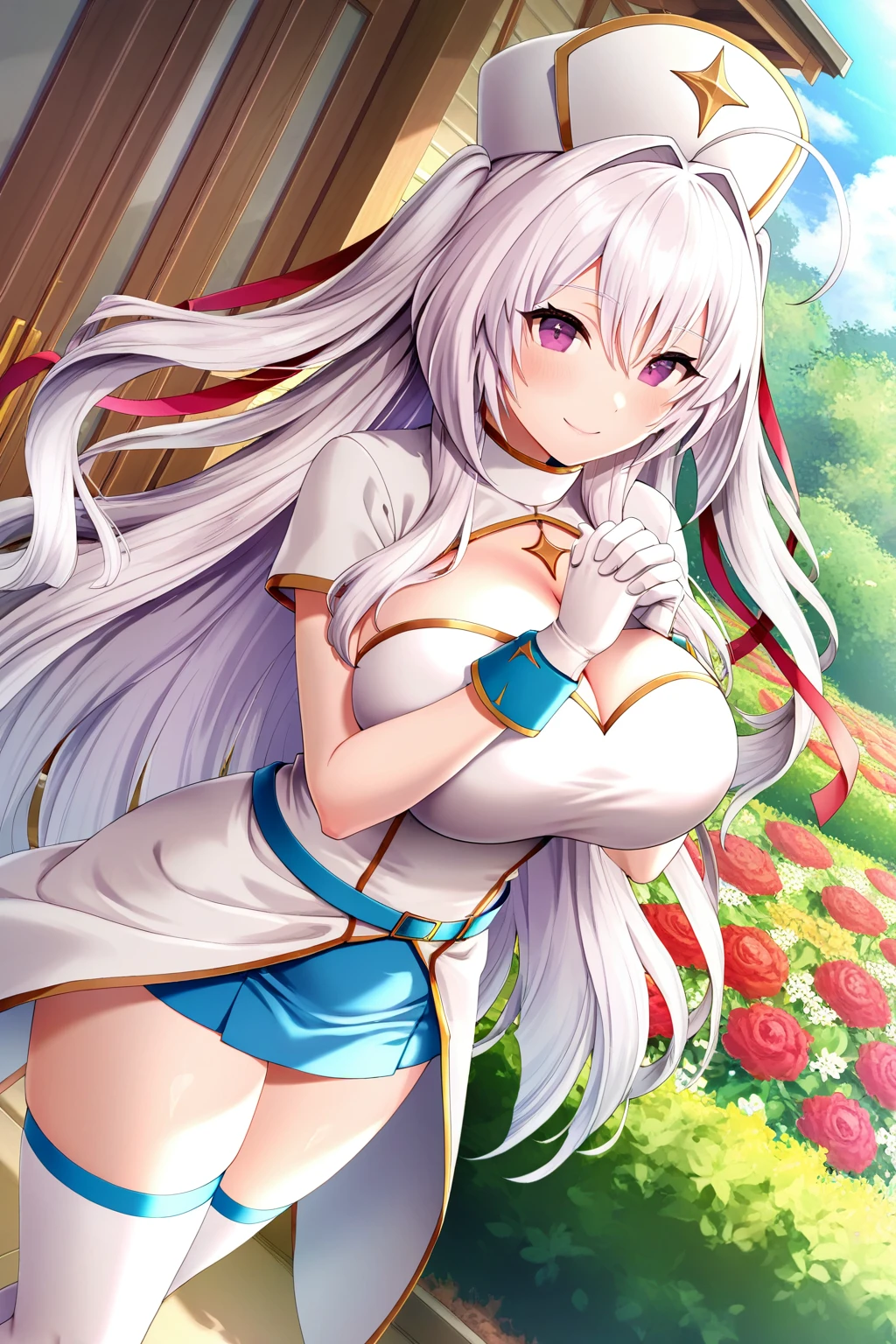 ei_cos, hair intakes, two side up, swm_ei, 1girl, solo, purple eyes, long hair, white hair, ahoge, large breasts, cleavage, hat, red hair ribbon, white dress, blue belt, short sleeves, bare forearms, white gloves, blue skirt, white thighhighs, blue boots,