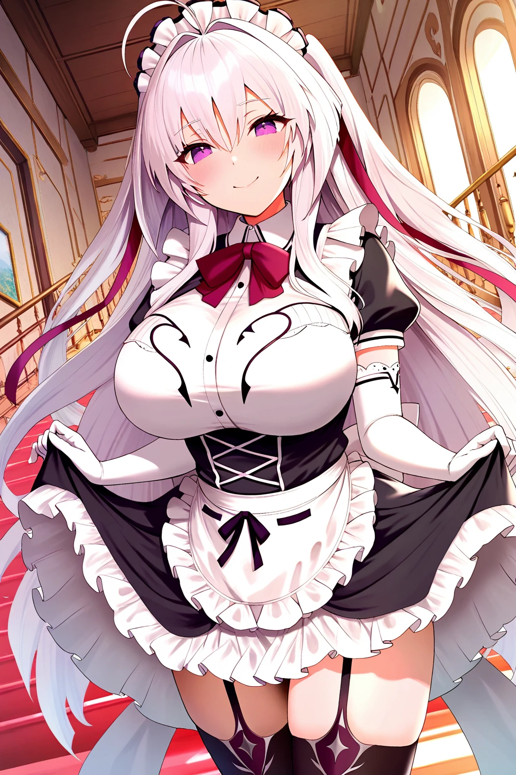 ei_maid, two side up, swm_ei, 1girl, solo, purple eyes, long hair, white hair, ahoge, large breasts, red hair ribbon, white maid headdress, red bowtie, white collared shirt, puffy short sleeves, white elbow gloves, black frilled skirt, white apron, white frills, garter straps, black thighhighs, brown shoes,