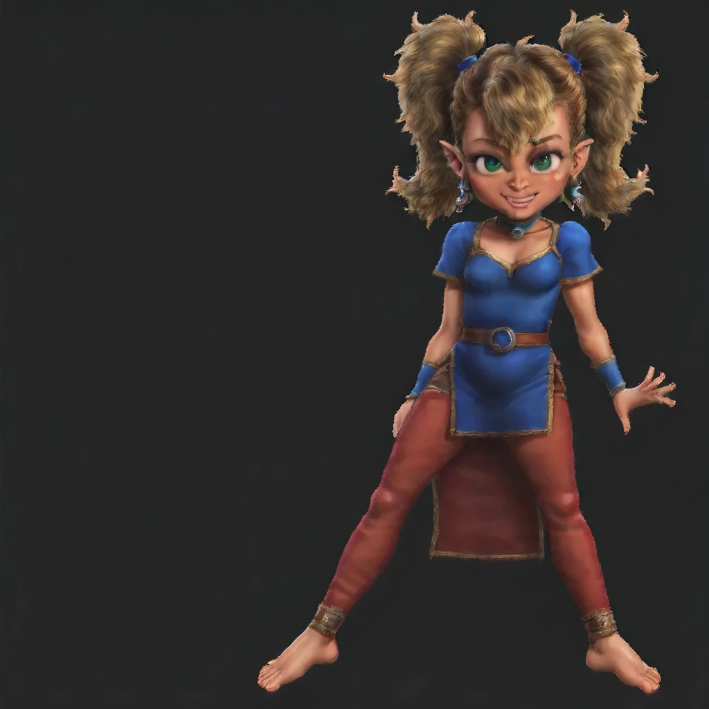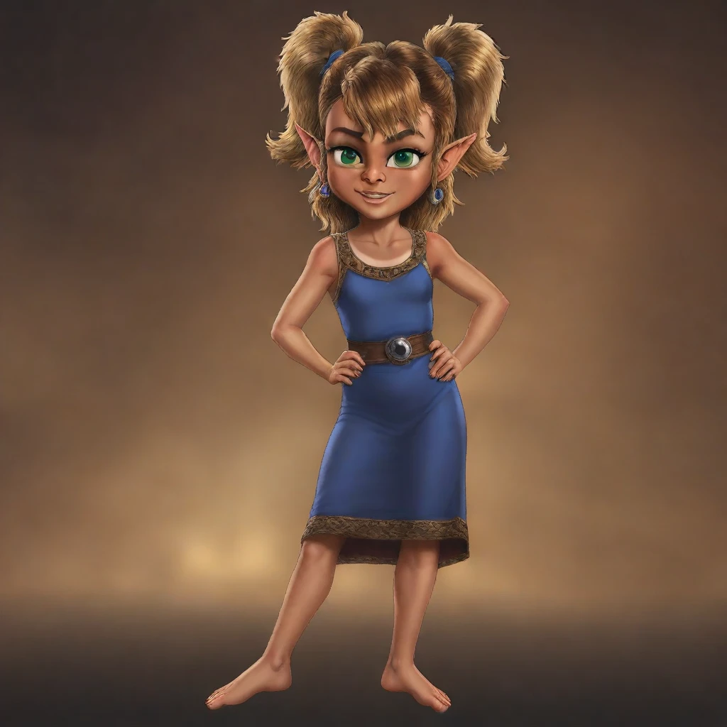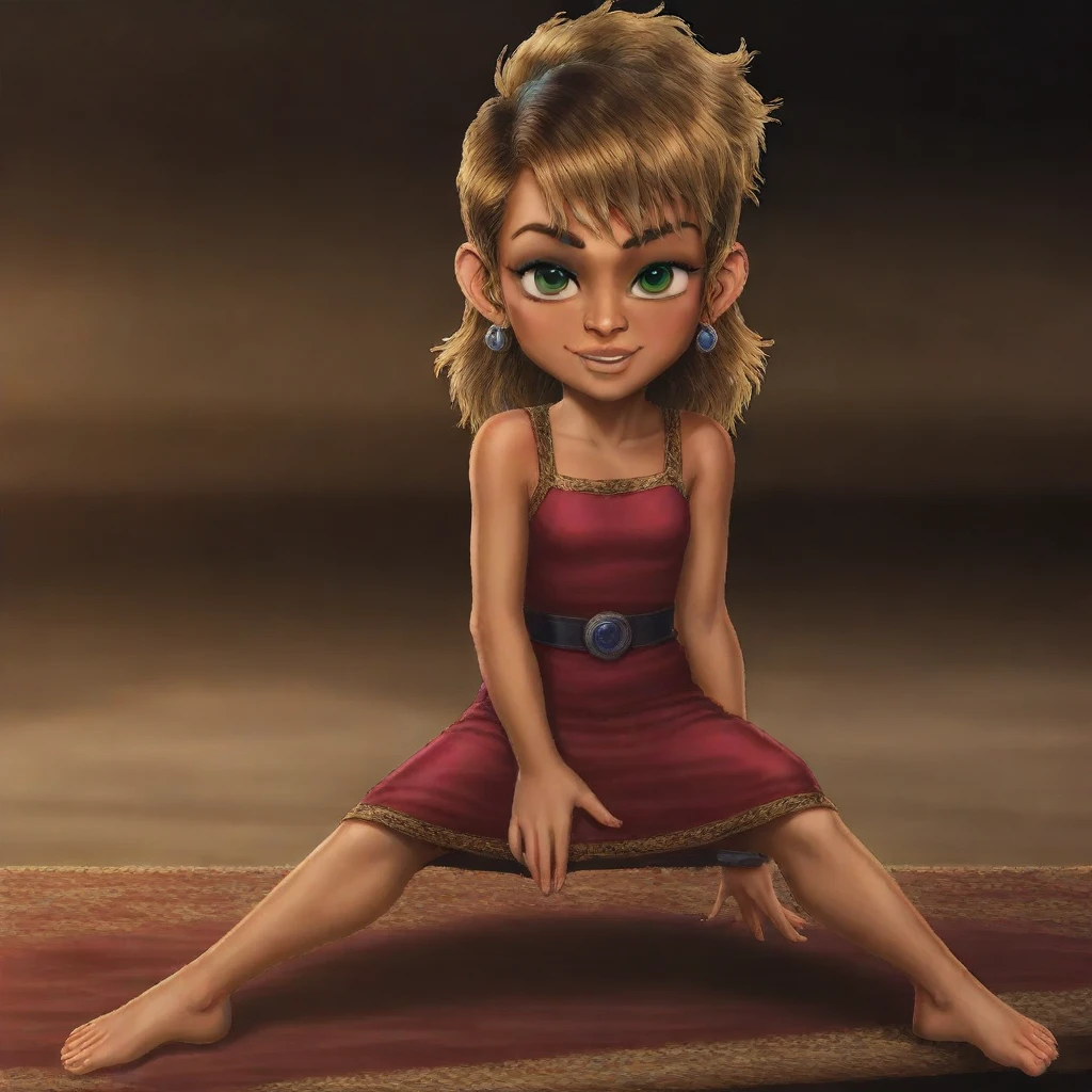 Pil,1girl, brown hair, hawk hair,green eyes, tan skin, solo, red tunic, blue tight pants, brown ankle boots, brown belt,standing,smile